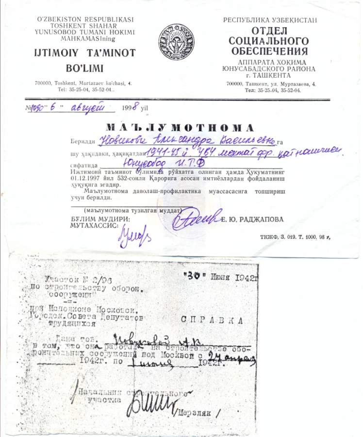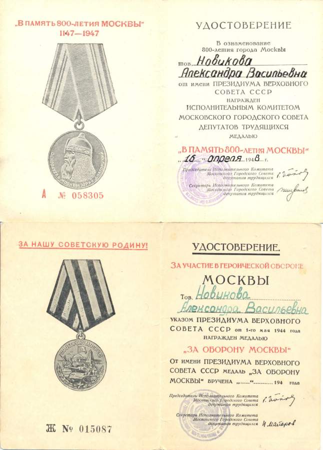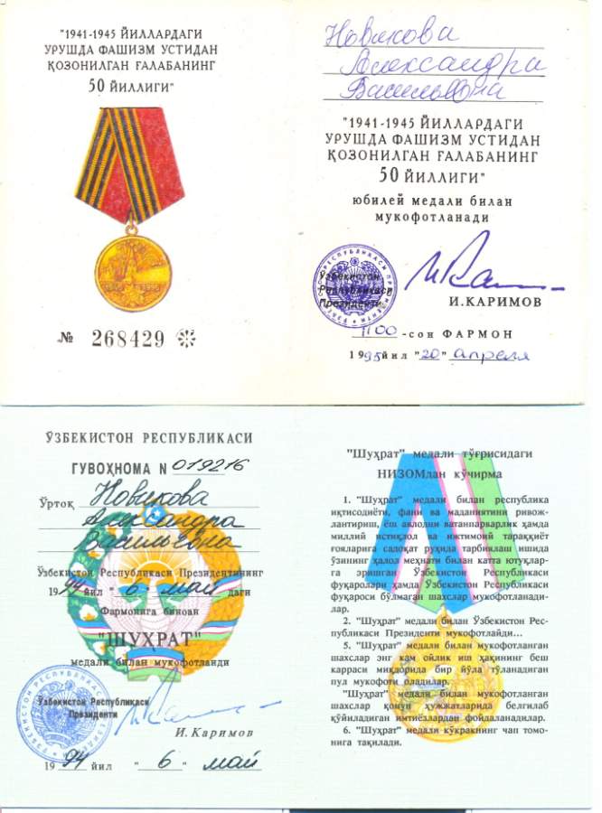 Поимо нижеуказанных наград имела медаль Узбекской ССР "Шухрат" №019216; медаль "75 лет Победы в Великой Отечественной войне 1941-1945г.г." А №0219494
