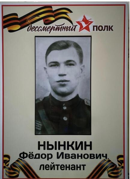 Нынкин Федор Иванович родился в 1921 году в селе Слободище. В ряды Красной Армии был призван Дятьковским РВК в августе 1939 года. С июня по август 1941 года участвовал в боевых действиях на Юго-Западном фронте. 13 августа 1941 года был тяжело ранен, находился на лечении в госпитале. С мая 1942 года по июль 1943 года сражался с фашистскими захватчиками на Воронежском фронте. За этот промежуток времени был трижды легко ранен: 11.7.1942, 12.3.1943, 20.7.1943. В 1943 году вступил в ряды ВЛКСМ. Воевал в должности командира 3 взвода 7 стрелковой роты 3 стрелкового батальона 516 стрелкового полка 107 стрелковой дивизии.