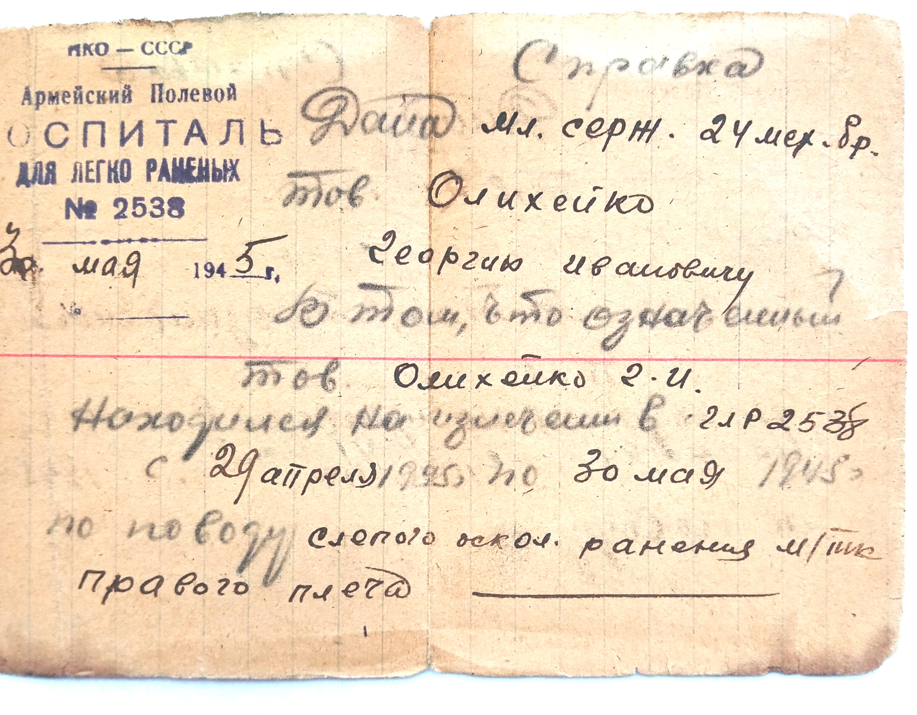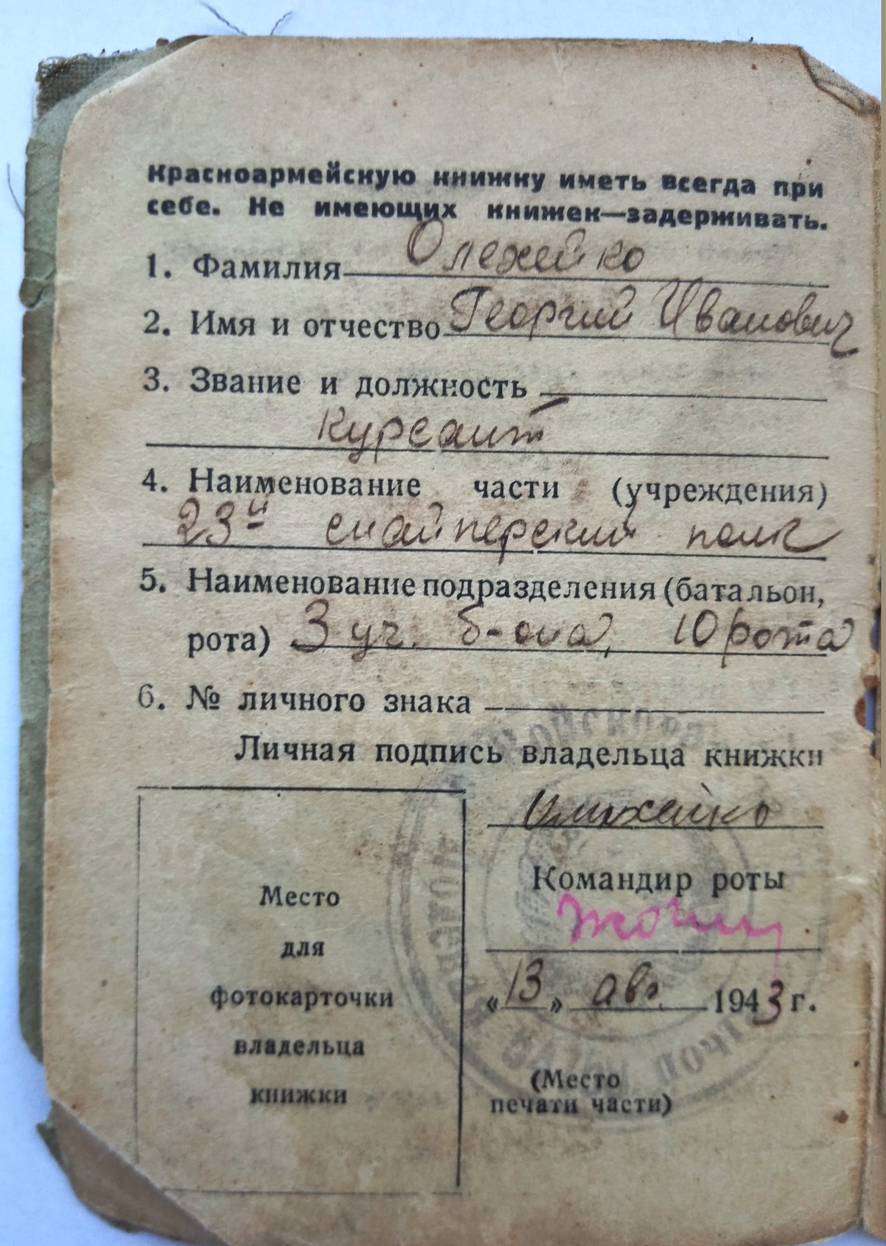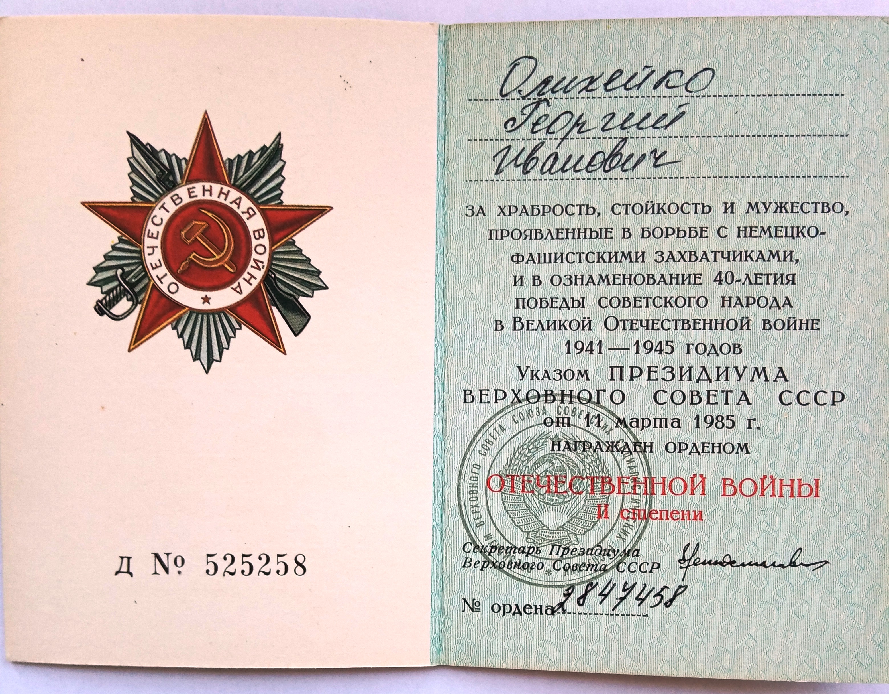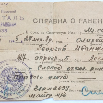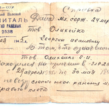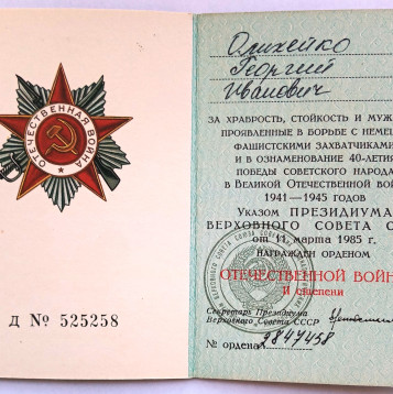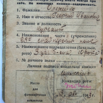 Олихейко Георгий Иванович родился 14.11.1925 года в КБАССР пос. Майский, ул. Р. Люксембург, 97. Образование 8 классов. Специальность до призыва - слесарь. Был призван на службу в августе 1942 года Майским РВК. С мая 1942 по июль 1943 года курсант 23-го снайперского полка 3 учебного батальона 10 роты (Орджоникидзевское военно-пехотное училище, курсант). С июля 1943 по апрель 1945 года служил в 13 танковом полку механиком-водителем среднего танка. С 29.04.1945 по 30.05.1945 находился в Армейском полевом госпитале № 2538 на лечении по поводу слепого осколочного ранения мягких тканей плеча. По окончании лечения направлен в 41 АЗСП. С июня 1945 по май 1946 механик-водитель САУ-77 мм 453 отдельной самоходной артиллерийской дивизии. С мая 1946 по декабрь 1949 командир орудия среднего танка 66 танкового полка. С декабря 1949 по март 1950 года радио-мастер 66 такового полка. 11.03.1985 награжден Орденом Отечественной войны II степени. № ордена 2847458. Удостоверение Д№525258.