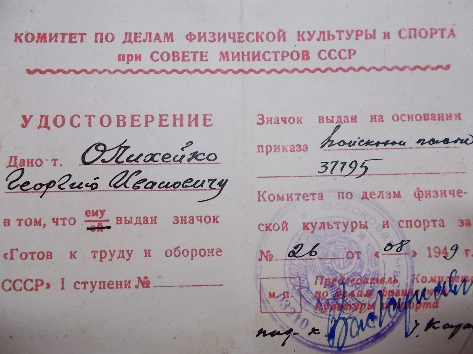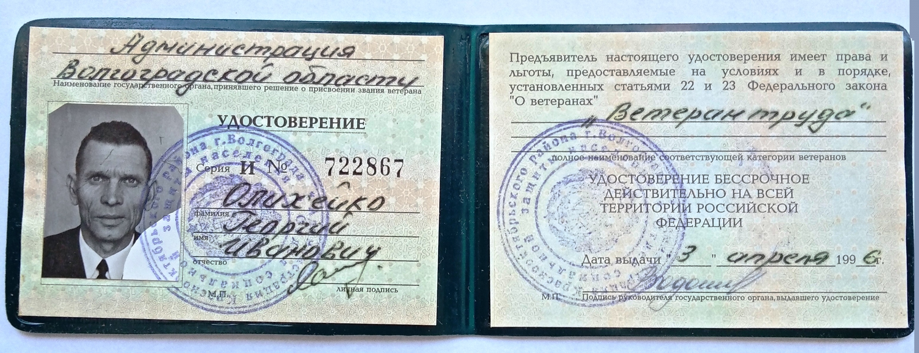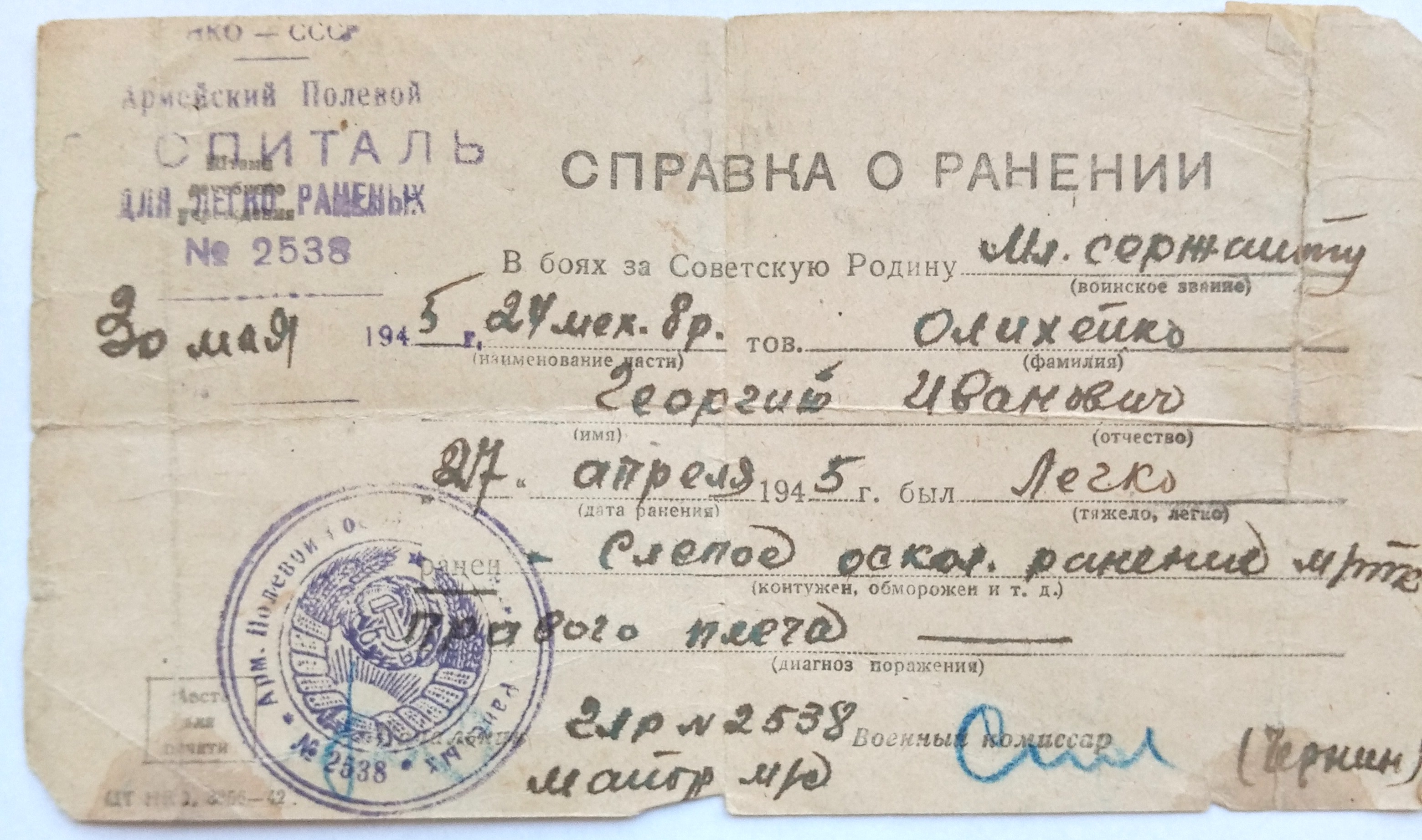 Олихейко Георгий Иванович родился 14.11.1925 года в КБАССР пос. Майский, ул. Р. Люксембург, 97. Образование 8 классов. Специальность до призыва - слесарь. Был призван на службу в августе 1942 года Майским РВК. С мая 1942 по июль 1943 года курсант 23-го снайперского полка 3 учебного батальона 10 роты (Орджоникидзевское военно-пехотное училище, курсант). С июля 1943 по апрель 1945 года служил в 13 танковом полку механиком-водителем среднего танка. С 29.04.1945 по 30.05.1945 находился в Армейском полевом госпитале № 2538 на лечении по поводу слепого осколочного ранения мягких тканей плеча. По окончании лечения направлен в 41 АЗСП. С июня 1945 по май 1946 механик-водитель САУ-77 мм 453 отдельной самоходной артиллерийской дивизии. С мая 1946 по декабрь 1949 командир орудия среднего танка 66 танкового полка. С декабря 1949 по март 1950 года радио-мастер 66 такового полка. 11.03.1985 награжден Орденом Отечественной войны II степени. № ордена 2847458. Удостоверение Д№525258.