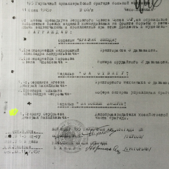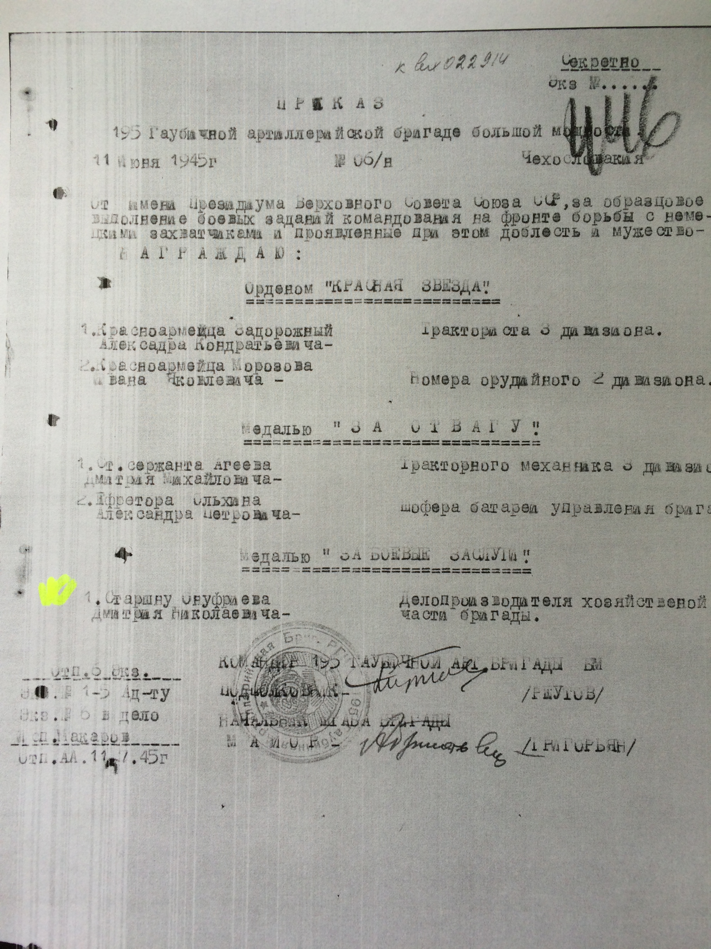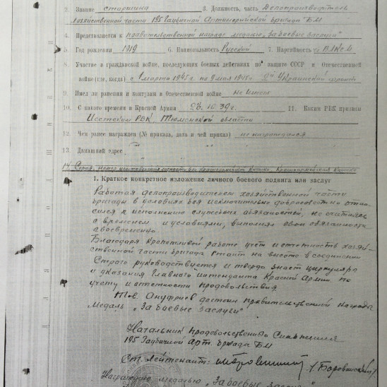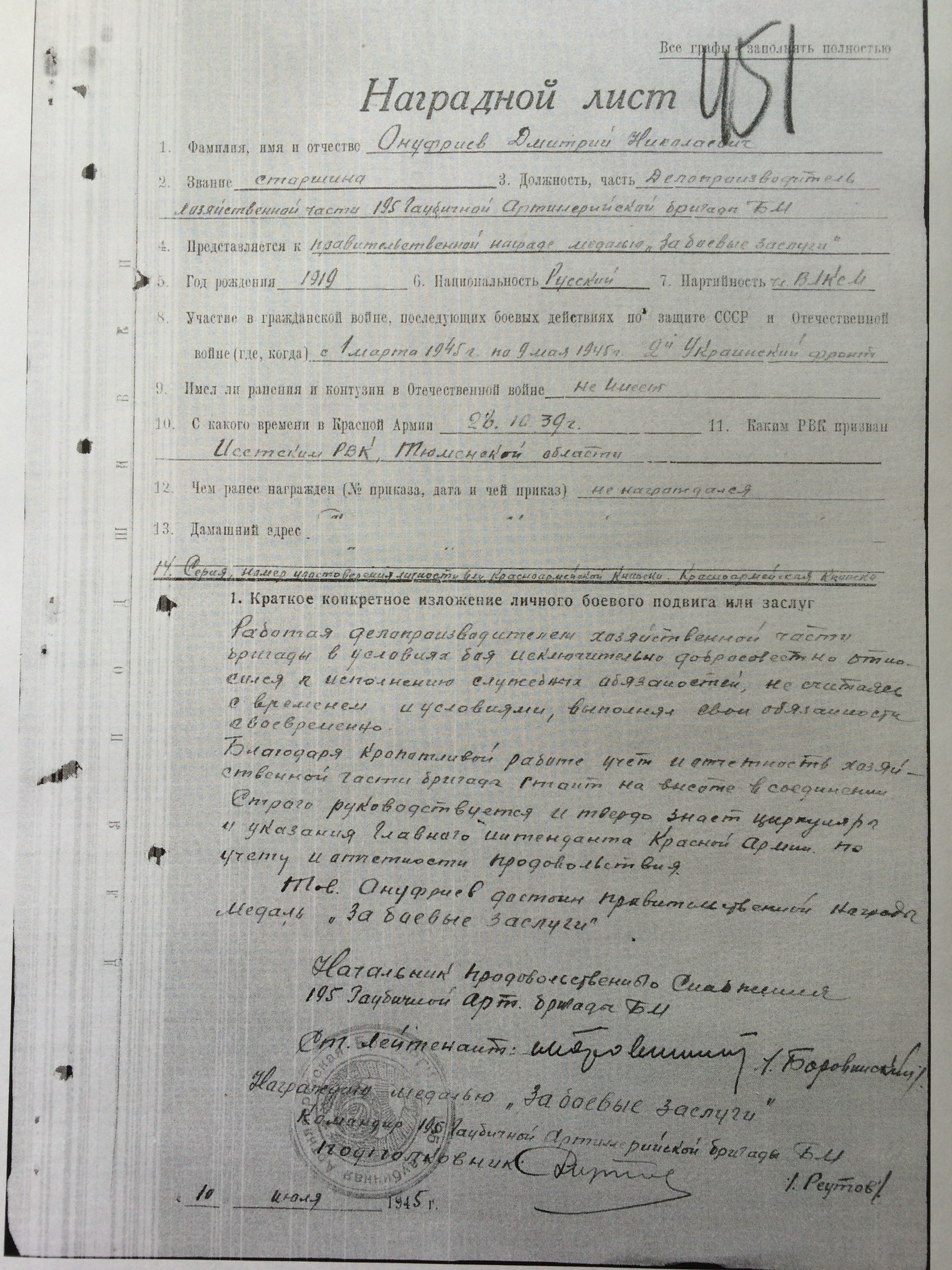 Онуфриев Дмитрий Николаевич, 1919 г.р., русский, член ВЛКСМ - муж моей тёти Клеопатры Яковлевны Онуфриевой (Приваловой). Из наградного листа от 10 июля 1945 года мне известно, что он был призван в Красную Армию 28 октября 1939 года Исетским РВК, Тюменской области. Служил делопроизводителем хозяйственной части 195 Гаубичной Артиллерийской бригады БМ. С 1 марта 1945 года по 9 мая 1945 года был на 2 Украинском фронте. Награждён Медалью "За боевые заслуги". После войны он женился на моёй тёте Пате. У них родились сын Фёдор и дочь Татьяна. Вечная память Онуфриеву Дмитрию Николаевичу! Вечная память всем воинам - героям!