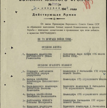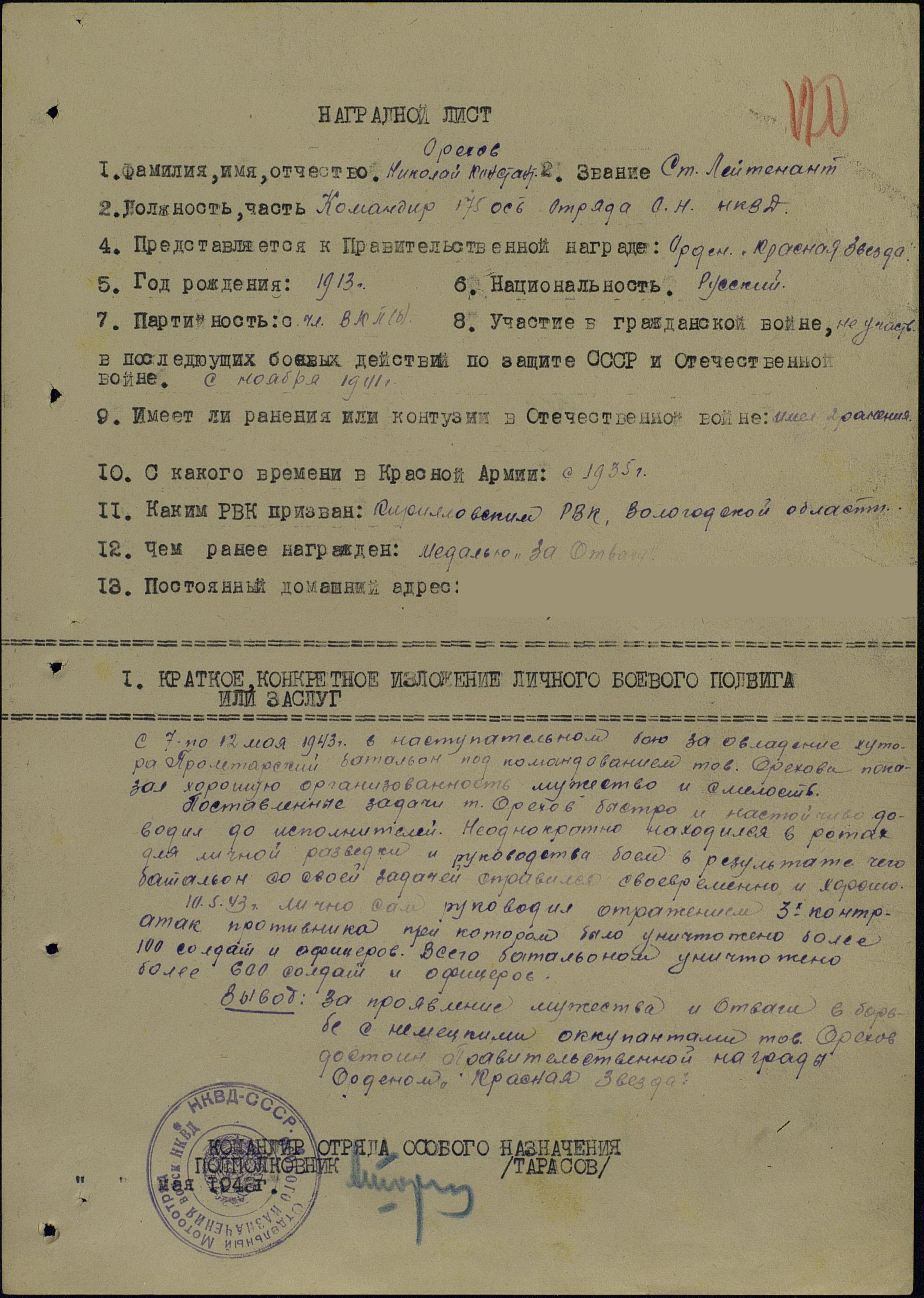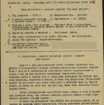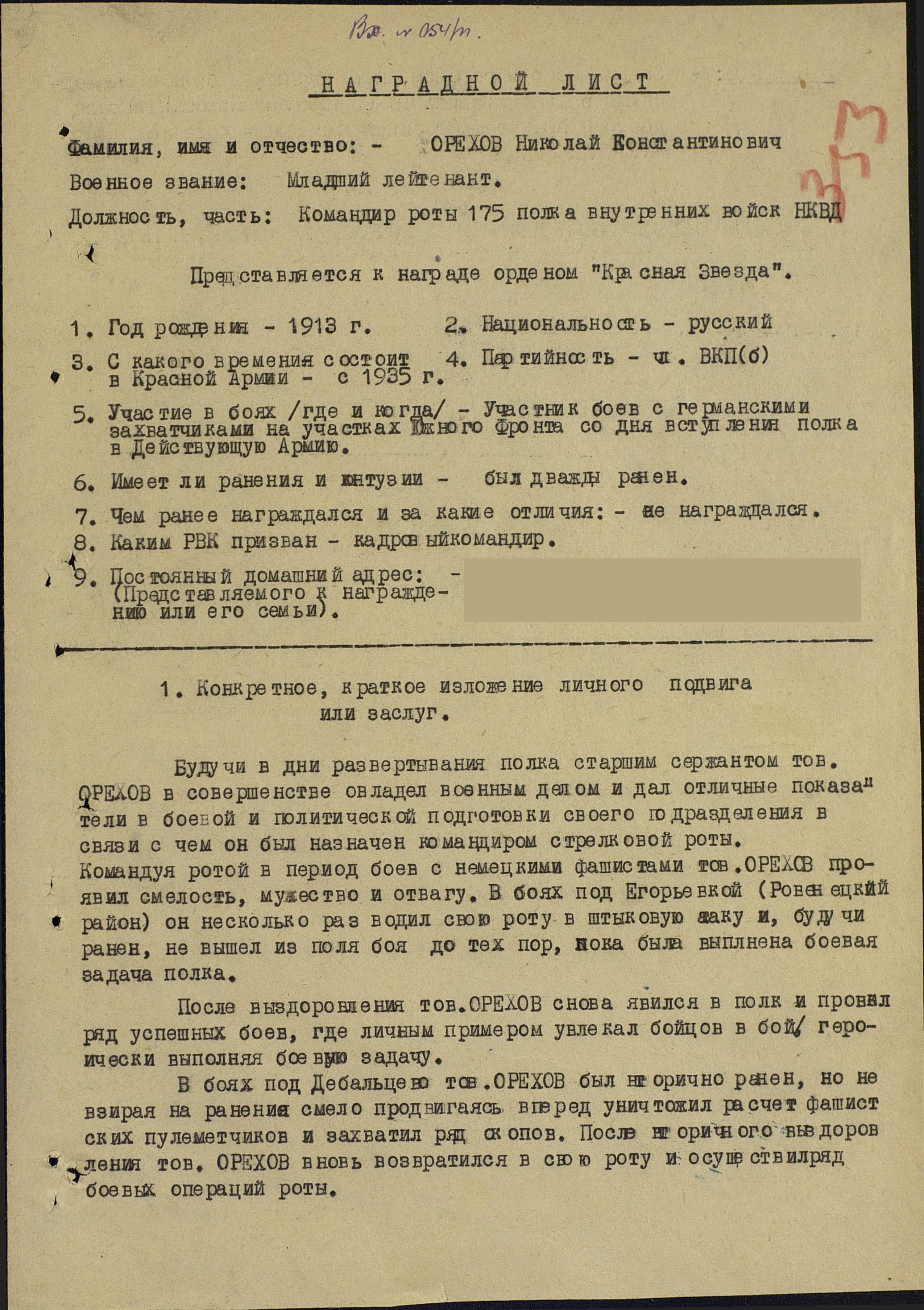 отвагу» ,он получил за бои под Егорьевкой и Дебальцево. Был дважды ранен. Участвовал в обороне Кавказа, прорыве " Голубой линии" в районе Крымского тоннеля. Воевал в составе 175 Краснознаменного стрелкового полка войск НКВД. От командира роты до командира батальона. В его батальоне были бойцы разных национальностей: ингуши , чеченцы , русские.