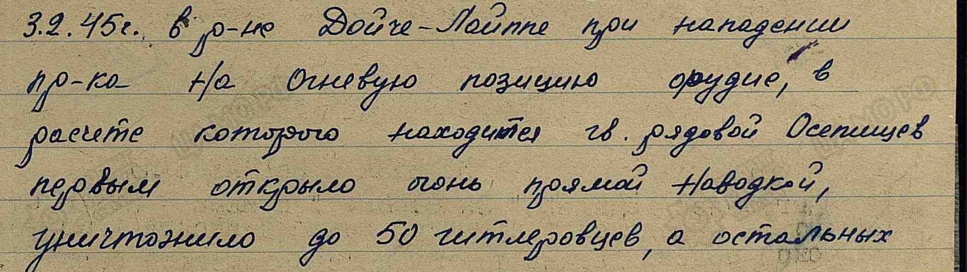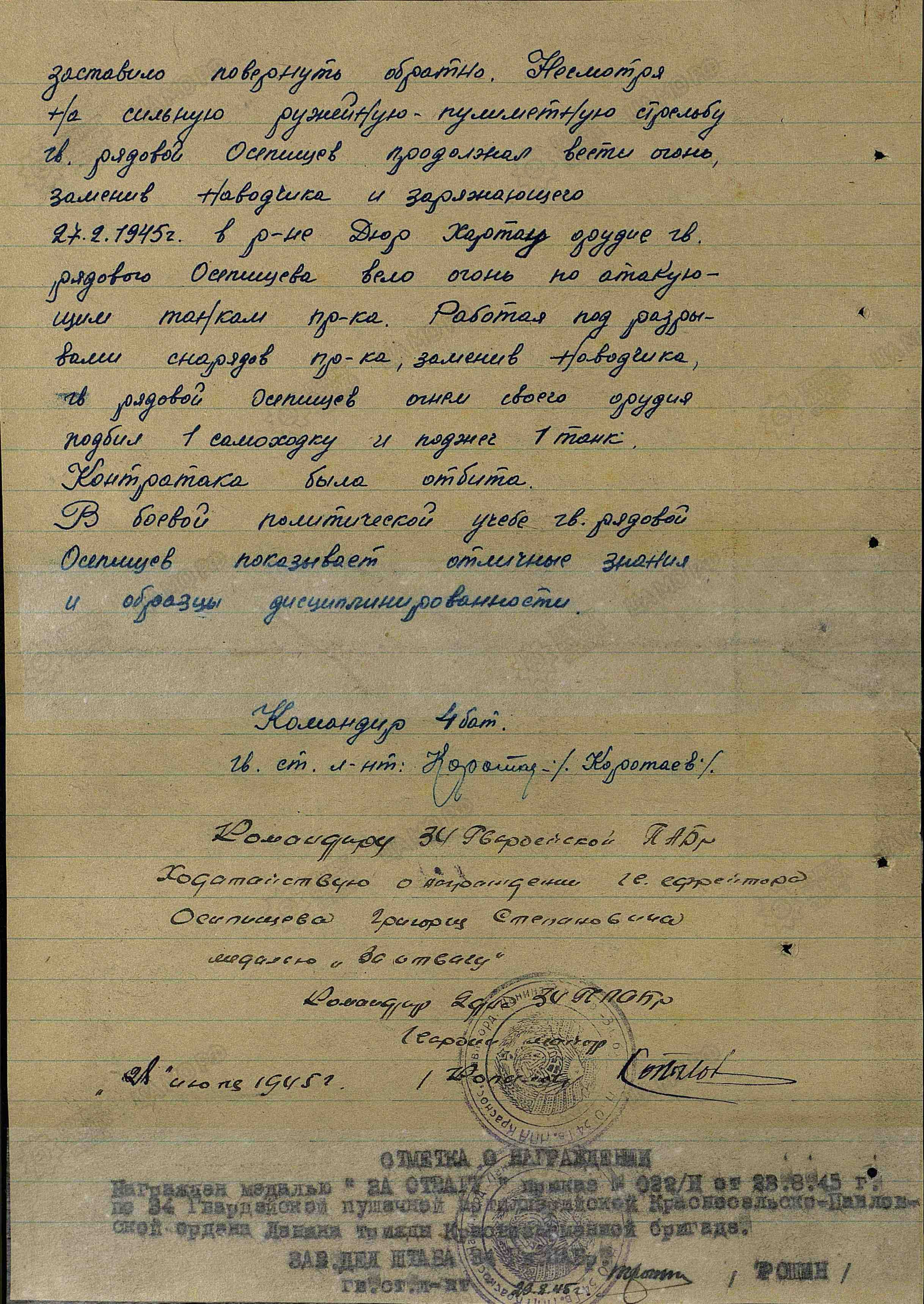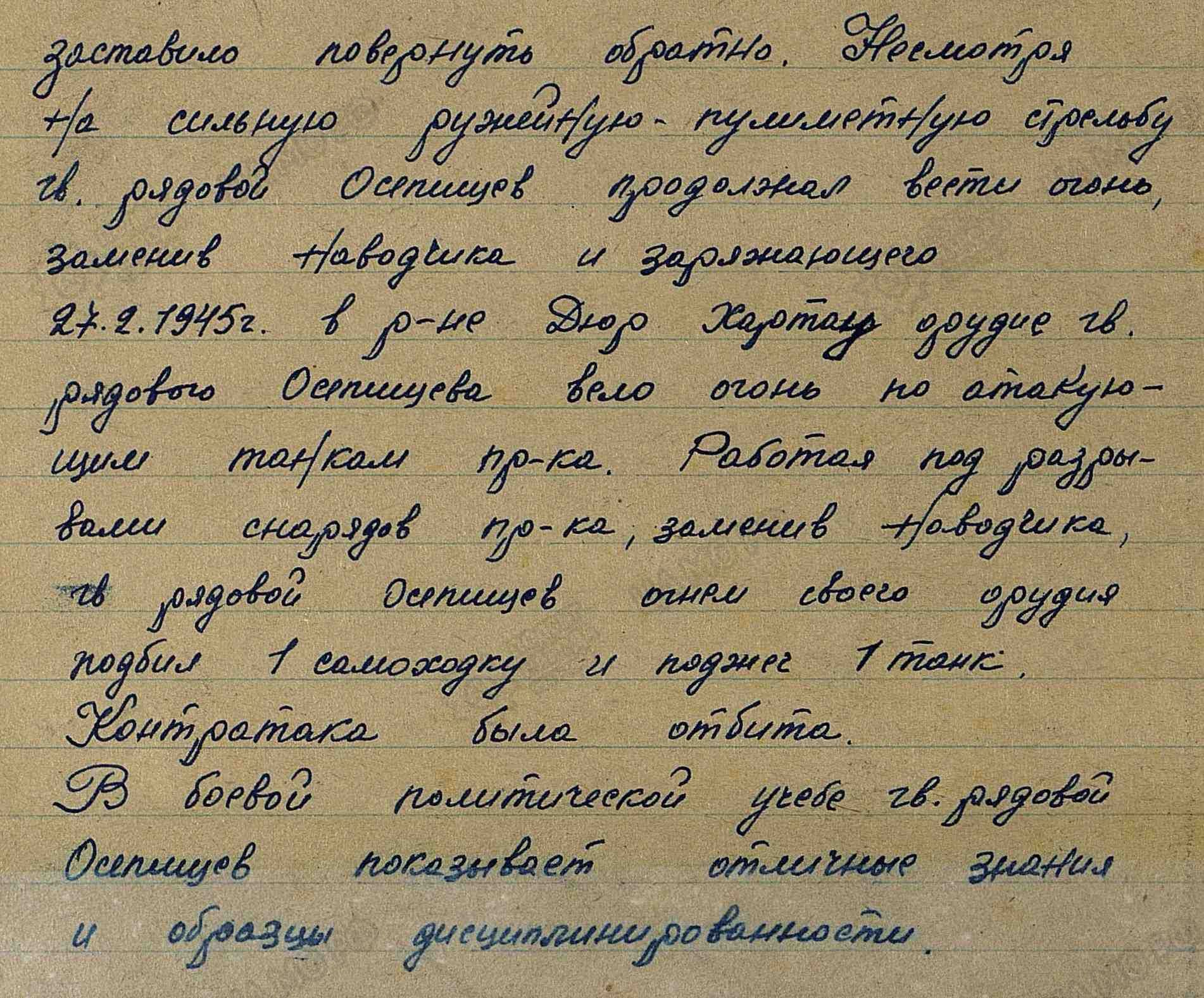 Я хочу рассказать о своем прадеде, отце моей бабушки, об Осепищеве Григорий Степановиче, 1902 года рождения. Он был жителем села Кашино Алтайского края. В РККА с 26.08.1941 года. В годы войны - гвардии красноармеец, орудийный номер 4-й батареи 34 Гвардейской Пушечно-артиллерийской Красносельско-Павловской ордена Ленина трижды краснознаменной армейской бригады 1 Украинского Фронта. Прошел всю войну, имеет ранения, награжден медалью «За отвагу», с фронта вернулся и проработал председателем совхоза в Аллейском районе. Умер в начале 1960 г.