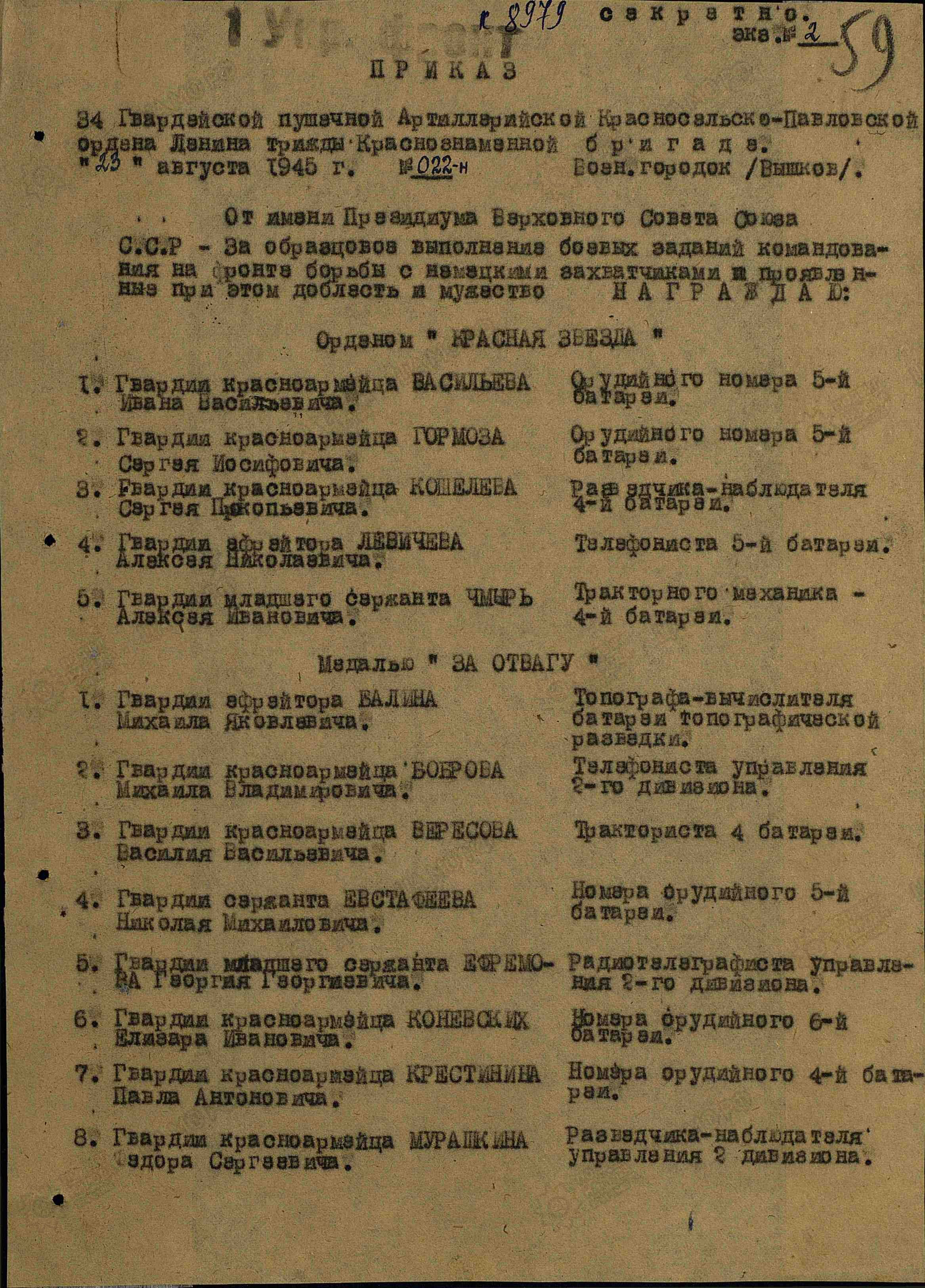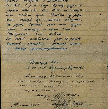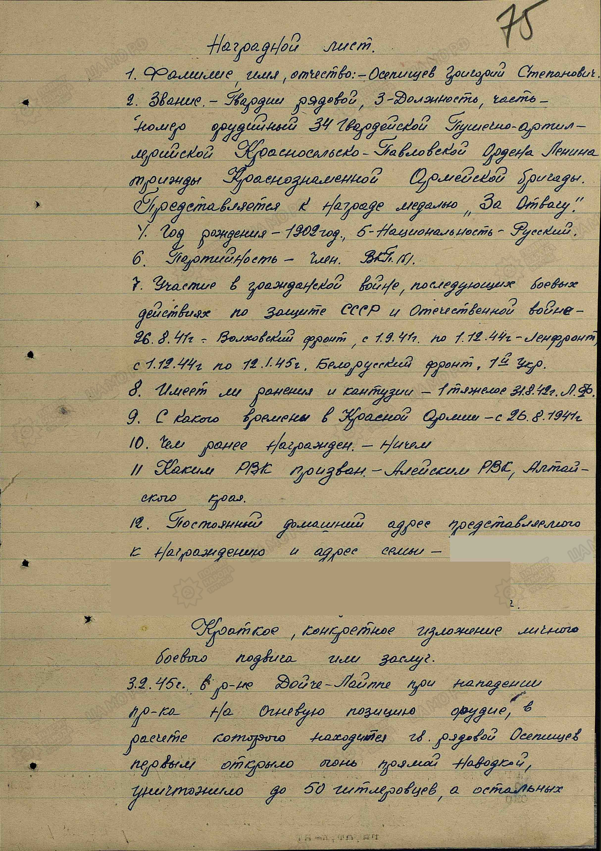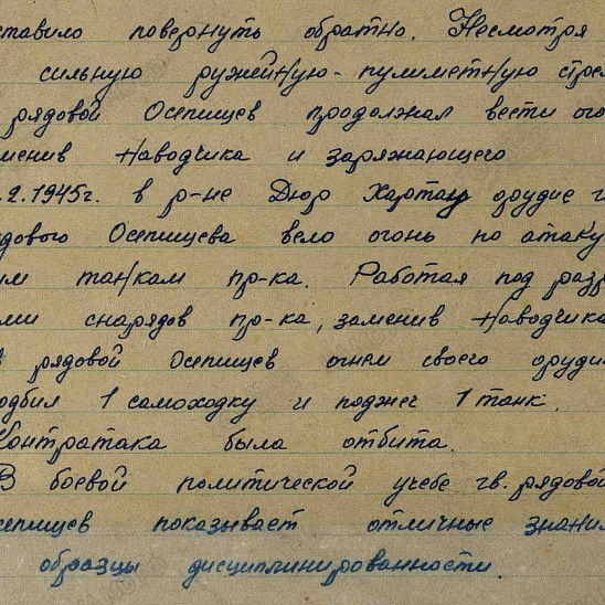 Я хочу рассказать о своем прадеде, отце моей бабушки, об Осепищеве Григорий Степановиче, 1902 года рождения. Он был жителем села Кашино Алтайского края. В РККА с 26.08.1941 года. В годы войны - гвардии красноармеец, орудийный номер 4-й батареи 34 Гвардейской Пушечно-артиллерийской Красносельско-Павловской ордена Ленина трижды краснознаменной армейской бригады 1 Украинского Фронта. Прошел всю войну, имеет ранения, награжден медалью «За отвагу», с фронта вернулся и проработал председателем совхоза в Аллейском районе. Умер в начале 1960 г.