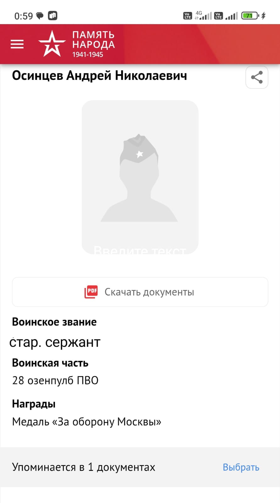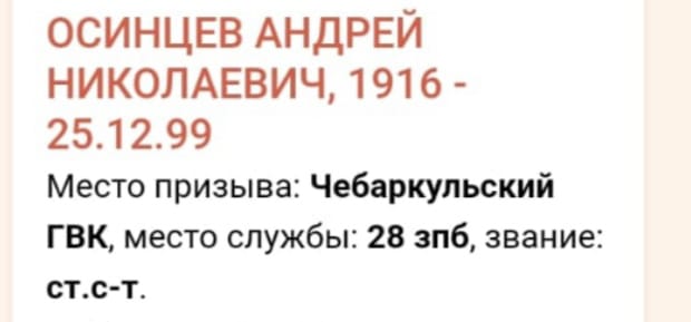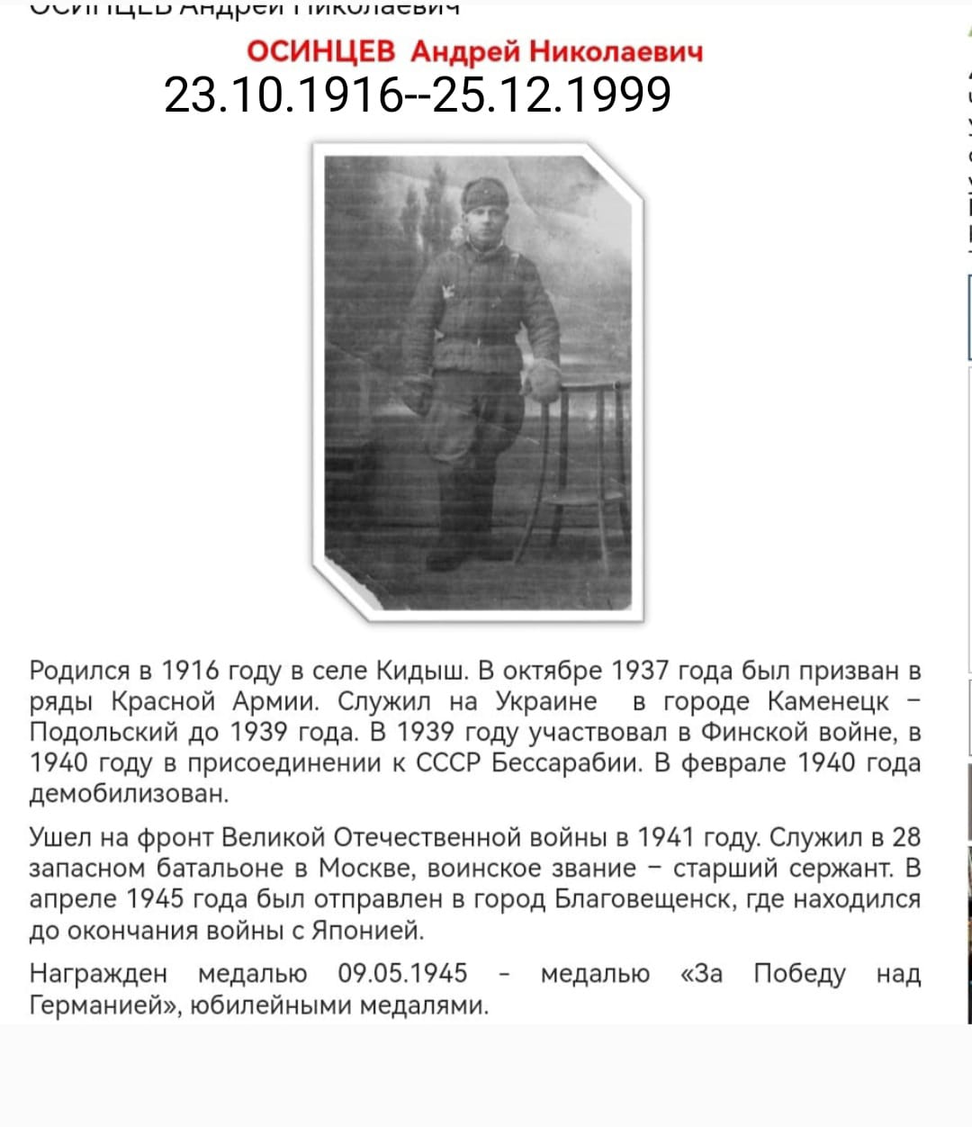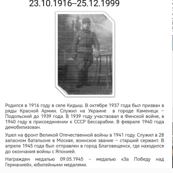 Родился 23.10.1916 года в селе Кидыш. В октябре 1937г. был призван в ряды Красной Армии. Место призыва: Чебаркульский ГВК. Служил на Украине в городе Каменск-Подольский до 1939 года. В 1939г. участвовал в Финской войне, в 1940г. в присоединении Бессарабии к СССР. В феврале 1940 года демобилизован. Ушел на фронт Великой Отечественной войны в июне 1941г. Служил в запасном батальоне ( 28 зенитно-пулеметная батарея ПВО) в Москве, воинское звание - старший сержант. Героически служил в Москве и Подмосковье, ежедневно обеспечивая бесперебойное снабжение армии медикаментами, продуктами питания, перевозил раненых. Воевал в боях за Москву. В апреле 1945г. был отправлен в город Благовещенск, впоследствии был переправлен с частью в Японию, где продолжил доблестное участие в боевых действиях, где находился до окончания войны с Японией. Награжден медалью 09.05.1945г. - медалью "За Победу над Германией"; медалью "За оборону Москвы"; удостоен наградой "За победу над Японией"; юбилейными медалями. По окончанию ВОВ работал председателем колхоза "Победа". Дата смерти 25.12.1999г. с.Кидыш.