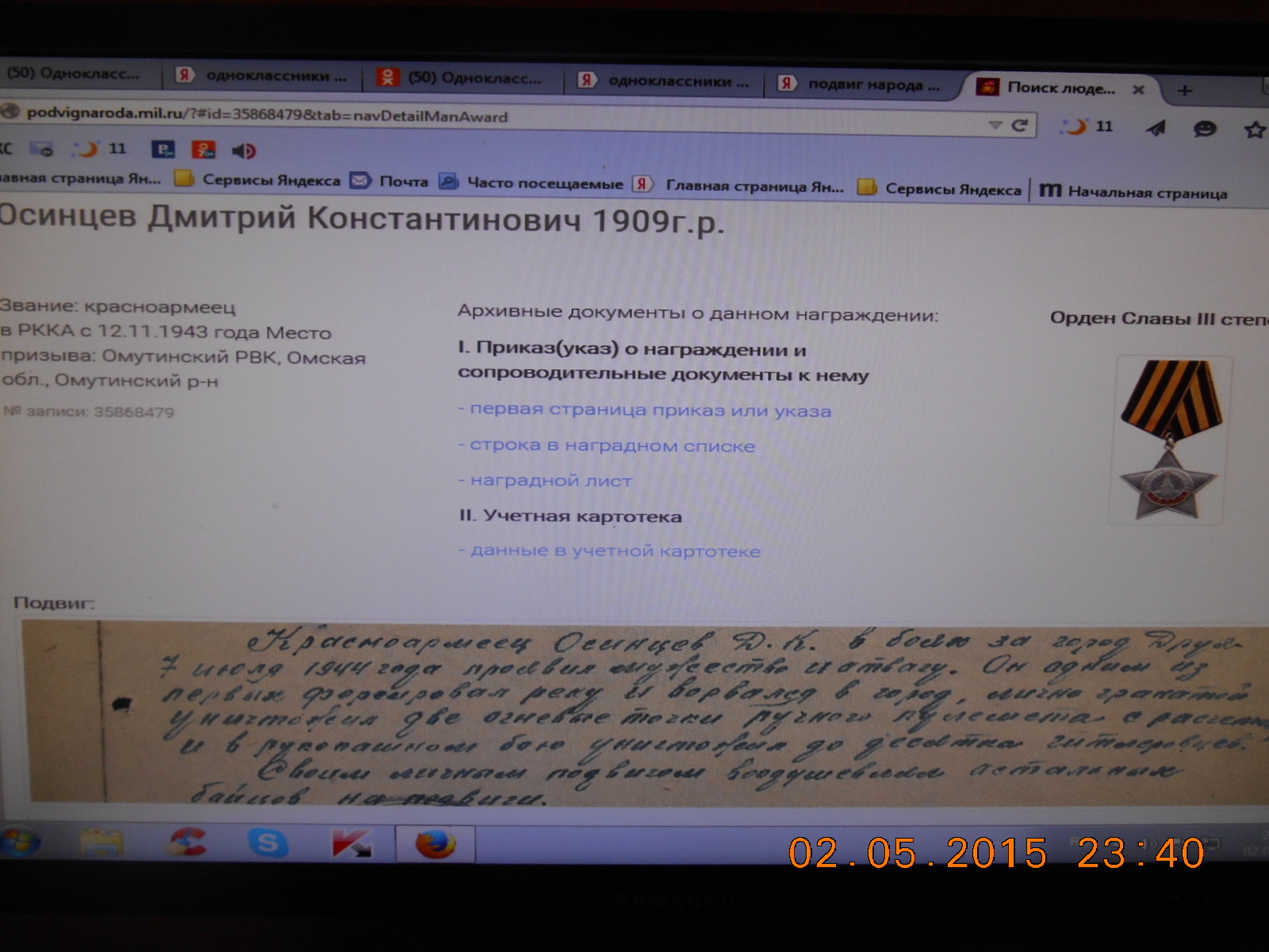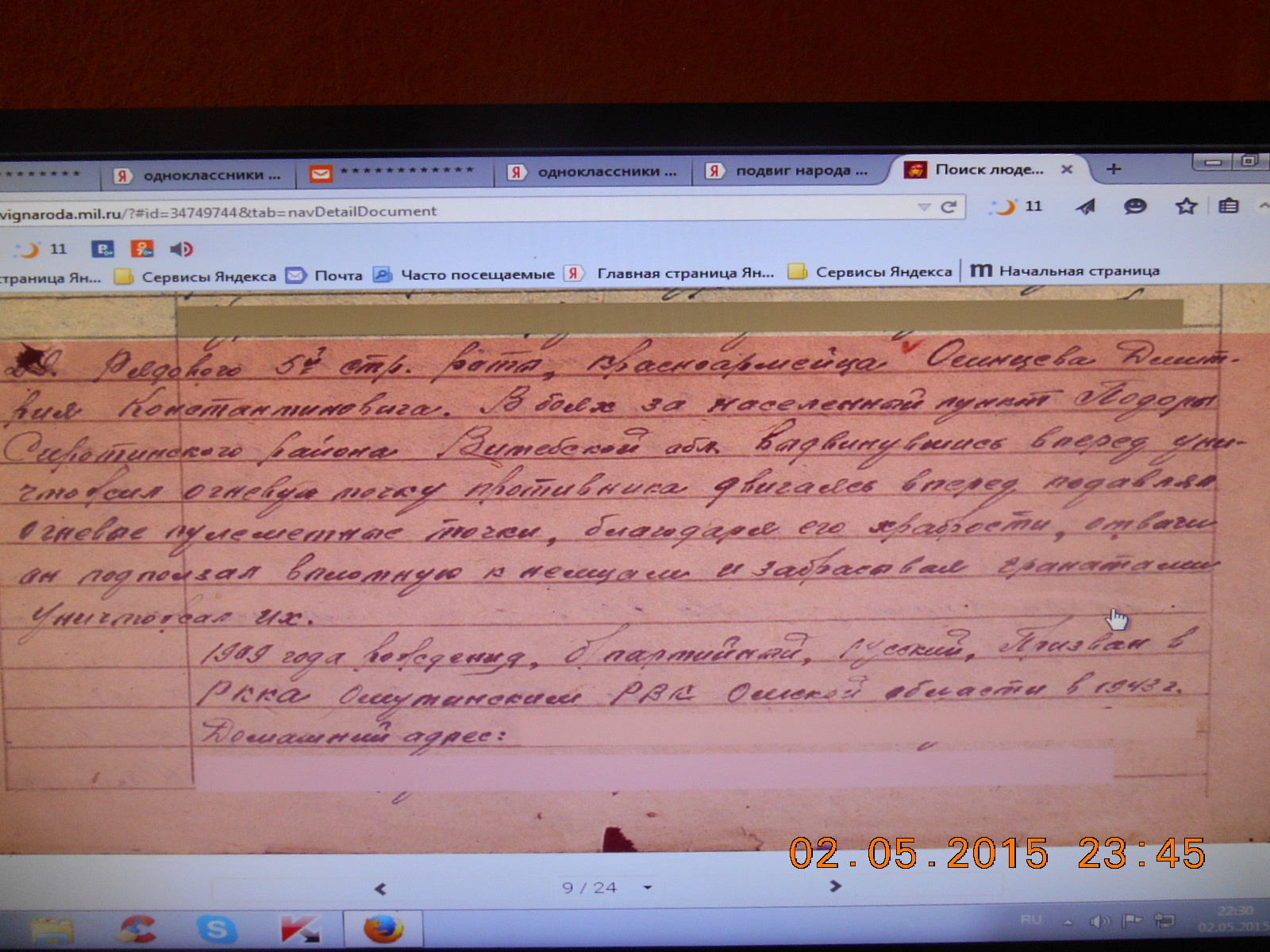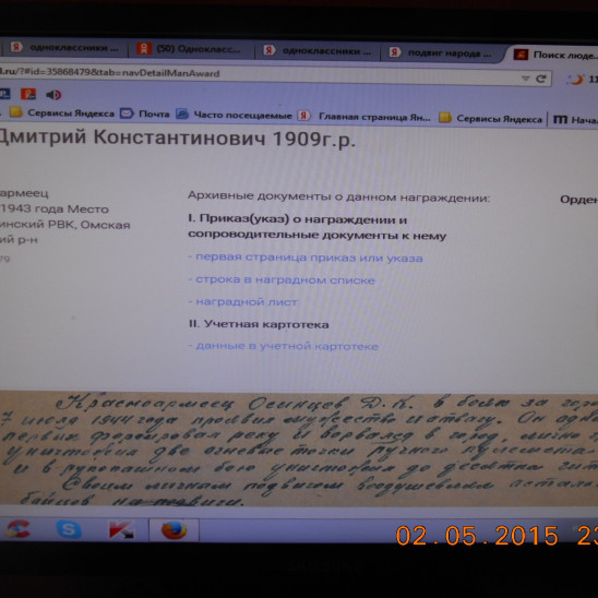 Мой дед,могучий сибиряк ,уходил на фронт с д.Крутинской Тюменской области,оставляя дома жену с маленькой дочкой Галей(моей мамой).Под Витебском получил осколочное ранение,из госпиталя был выписан домой на костылях.Всю жизнь прожил с осколками,которые нельзя было трогать и врачи их оставили "жить" в нём навсегда.Про войну никогда не рассказывал,по натуре был молчаливым и суровым,а уж про это тем более не любил распространяться.Подняли на ноги девятерых детей с бабушкой,бесчисленное количество внуков и уже правнуков.Наделённый крепким сибирским здоровьем умер в 80 лет,всё-таки военные раны делали своё разрушающее дело.Помним,гордимся и никогда не забудем подвиг нашего деда,подвиг нашего народа,нашей страны в той далёкой,страшной войне!