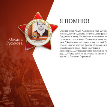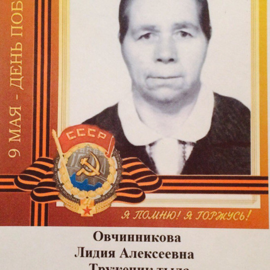 Овчинникова Лидия Алексеевна 1925-2014гг. Из-за инвалидности с детства не попала на фронт. Трудилась в тылу. Не любила вспоминать те страшные годы войны: "Зачем вам знать этот ужас? Знайте всегда солнце и чистое небо!" Только иногда краткие фразы: "Гнилая картошка с замёрзшего поля - было настоящим лакомством...", "Взрывы бомб похожи на гром в аду...", "Тогда дети не делились на своих и чужих..." Помним! Гордимся!