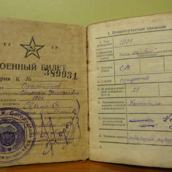 Охальников Степан Николаевич родился в селе Сартаково (Нижегордская обл.Богородский р-он) в крестьянской семье.С 1926 по 1933 год служил на Балтийском флоте в г.Кронштадт на линкоре "Марат". 4 ноября 1941 года Степан Николаевич был призван Богородским РВК по мобилизации и прошёл всю войну в должности начальника парома (160 отдельный тяжёлый понтонный мостовой батальон(с ноября 1941 года по июль 1944)и 6 отдельный понтонный мостовой полк (с июля 1944 года по октябрь 1945 года) ).Он принимал участие в Сталинградской битве .День Победы 9 мая встретил в столице Австрии Вене.Но в этот день война для него не закончилась.Степан Николаевич был переброшен на Дальний Восток,где принимал участие в войне против японских империалистов.В составе 6 отдельного понтонного мостового полка обеспечивал переброску войск на реках Зея и Бурея в Амурской области.2 октября 1945 года он был демобилизован и вернулся в родное село,где до пенсии работал в колхозе.За участие в Великой Отечественной войне Степан Николаевич награждён орденом "Красная звезда " и медалями.