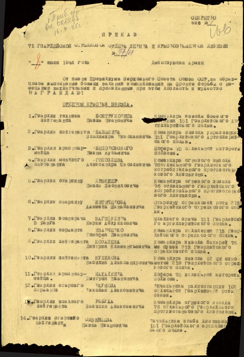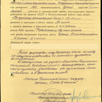 На войне получил звание гвардии младший сержант, должность наводчик станково го пулемета 210 гвардейского стрелкового полка, 71 гвардейской стрелковой дивизии. Участвовал в форсировании реки Западная Двина, освобождении Белоруссии. Награжден « Орденом Отечественной войны IIстепени» и «Орденом Славы III степени». Выписка из наградного листа: «Умело форсировал реку Западная Двина на плоту из подручного материала, со станковым пулеметом 24 июня 1944 года. В наступлении на деревню Мамойка Бешенковского района Витебской области 25 июня 1944 года, огнем своего пулемета уничтожил две пулеметных точки противника и 8 вражеских солдат». Прошел всю войну и был демобилизован на основании приказа Верховного главнокомандующего.