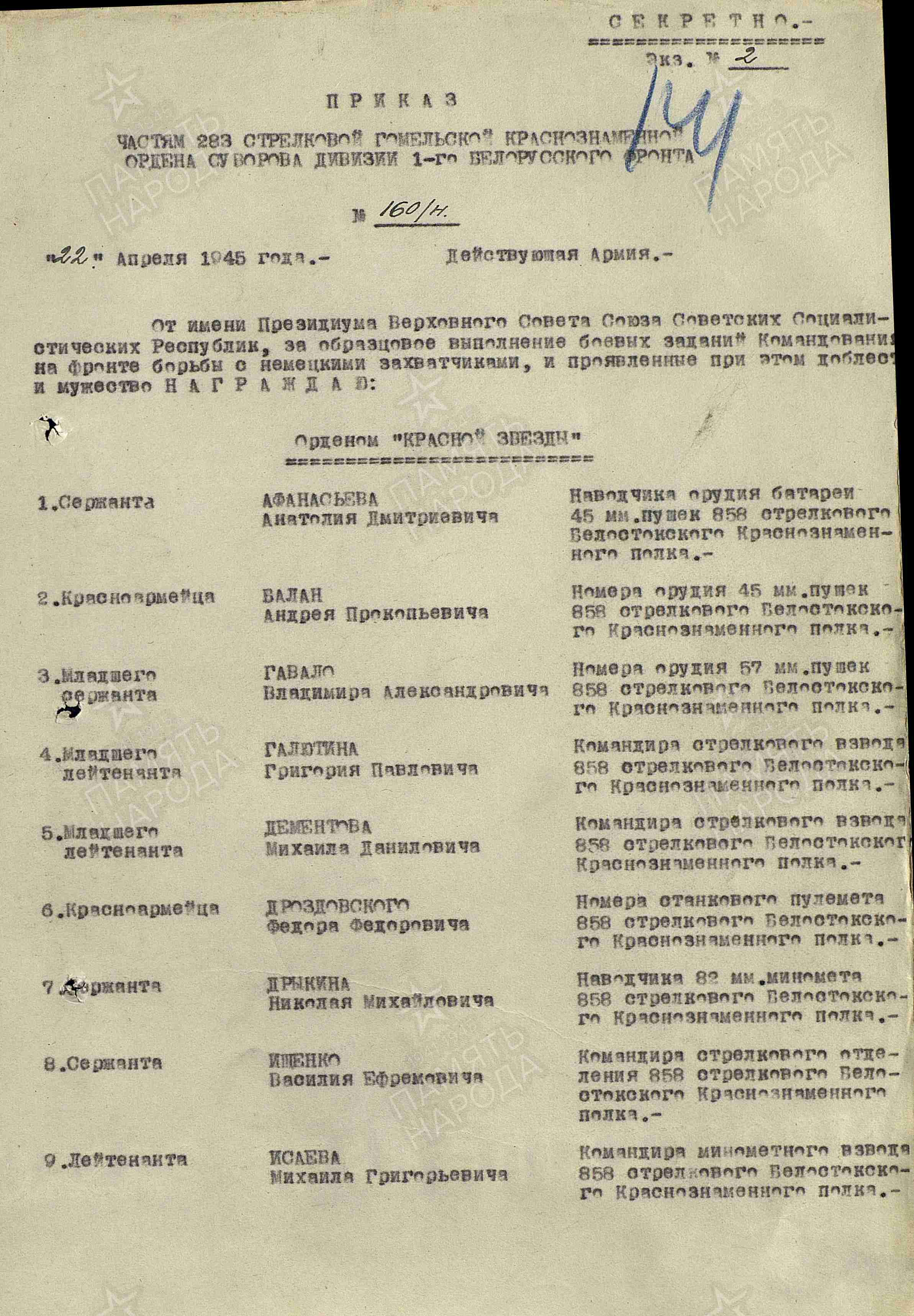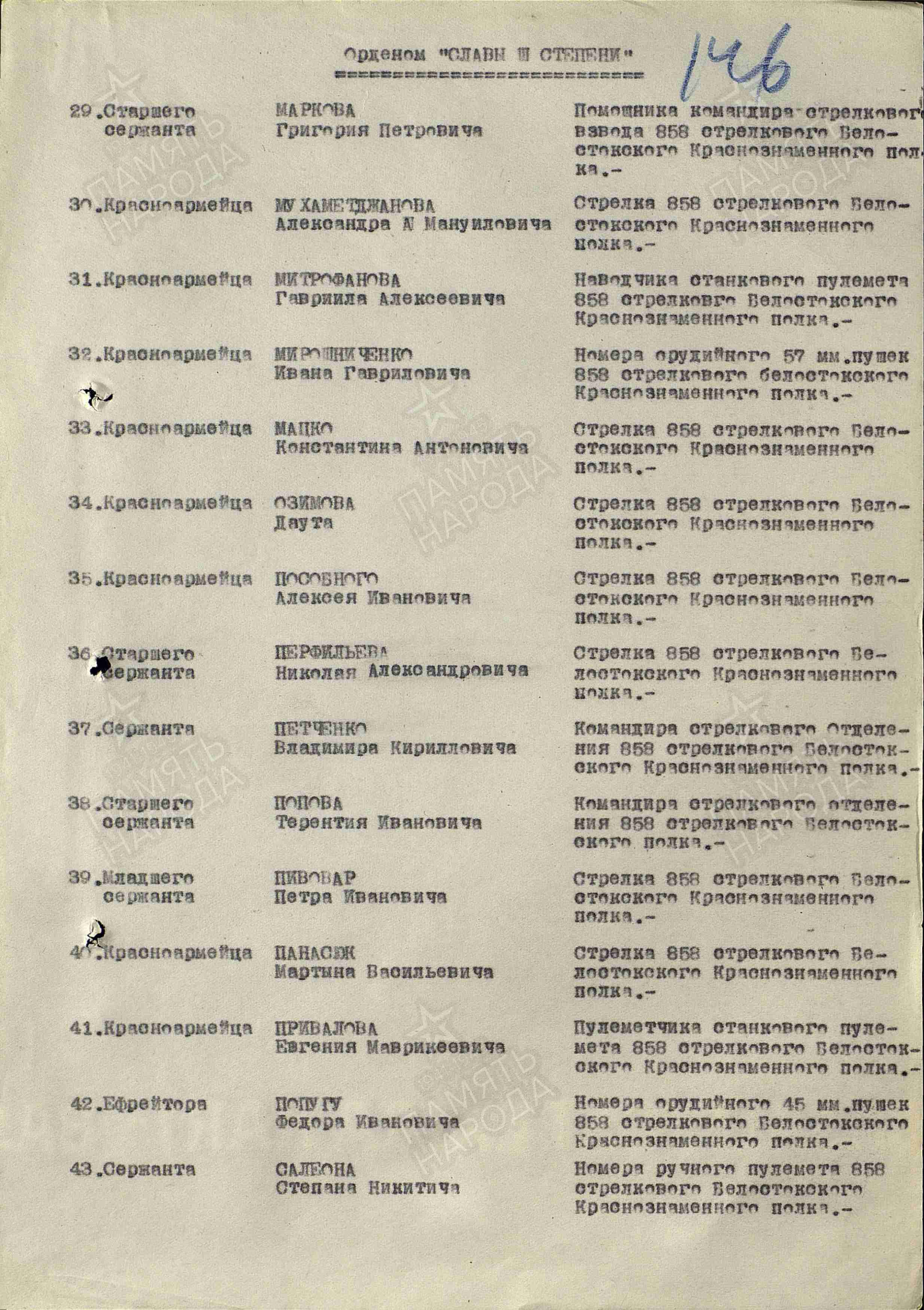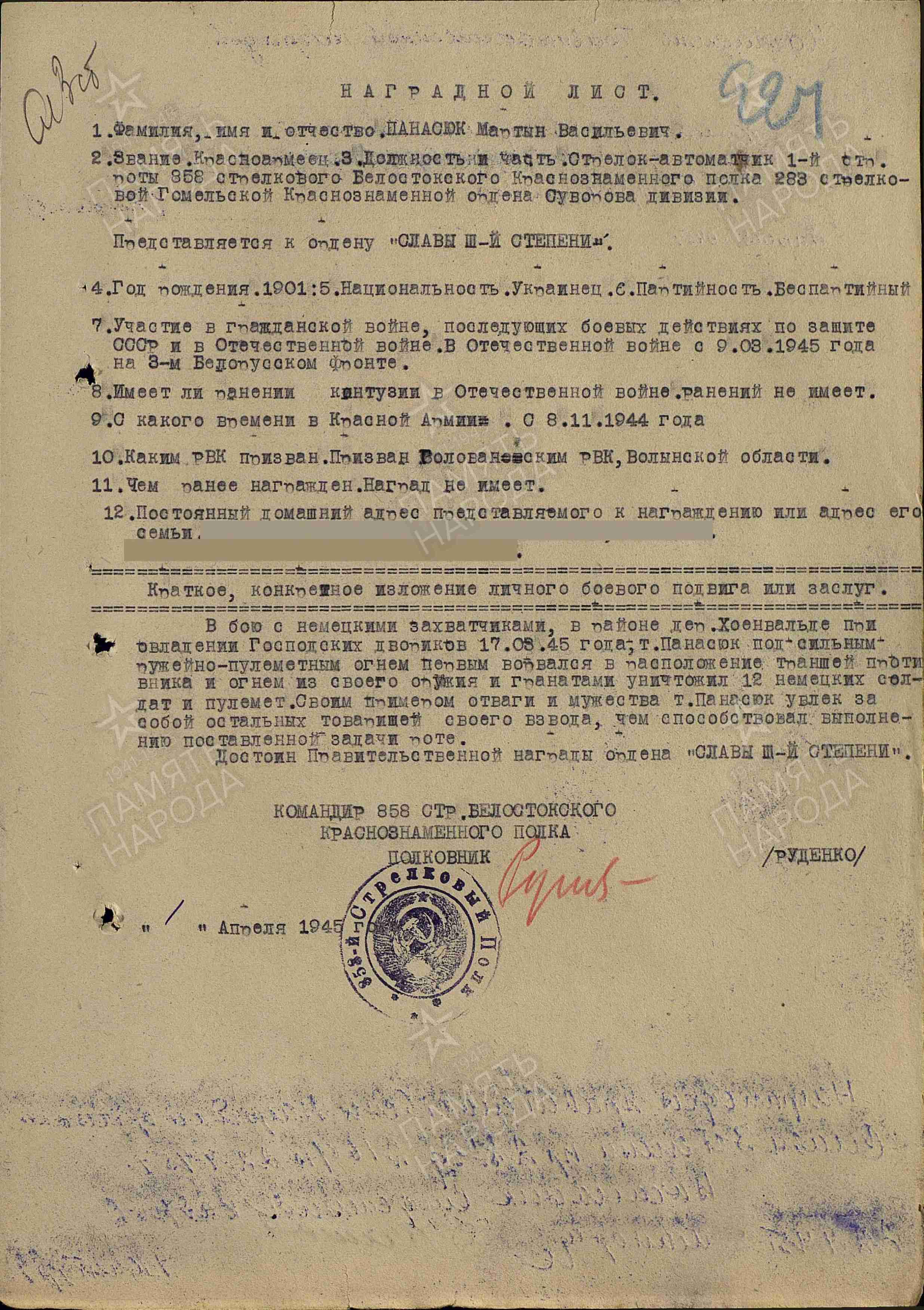Боевой путь (воинские части): • 858й стрелковый полк (858 сп); • 283я стрелковая дивизия (283 сд); • 338й стрелковый полк (338 сп) — последнее место службы; • 379й запасной стрелковый полк (379 зсп) — военнопересыльный пункт. Панасюк Мартын Васильевич был награждён орденом Славы III степени. Подробные сведения о награждении: Дата награждения: 22.04.1945. Кто наградил: 283я стрелковая дивизия(КСД) 1го Белорусского фронта. Номер приказа: № 160/н от 22.04.1945. 17 марта 1945 года в бою с немецкими захватчиками в районе деревни Хоенвальде при овладении «Господскими двориками» Панасюк под сильным ружейно-пулемётным огнём первым ворвался в расположение траншей противника и огнём из своего оружия и гранатами уничтожил 12 немецких солдат и пулемёт. Своим примером отваги и мужества Панасюк увлёк за собой остальных товарищей своего взвода, чем способствовал выполнению поставленной задачи ротой. За этот подвиг 22 апреля 1945 года Панасюк был награждён орденом Славы III степени.