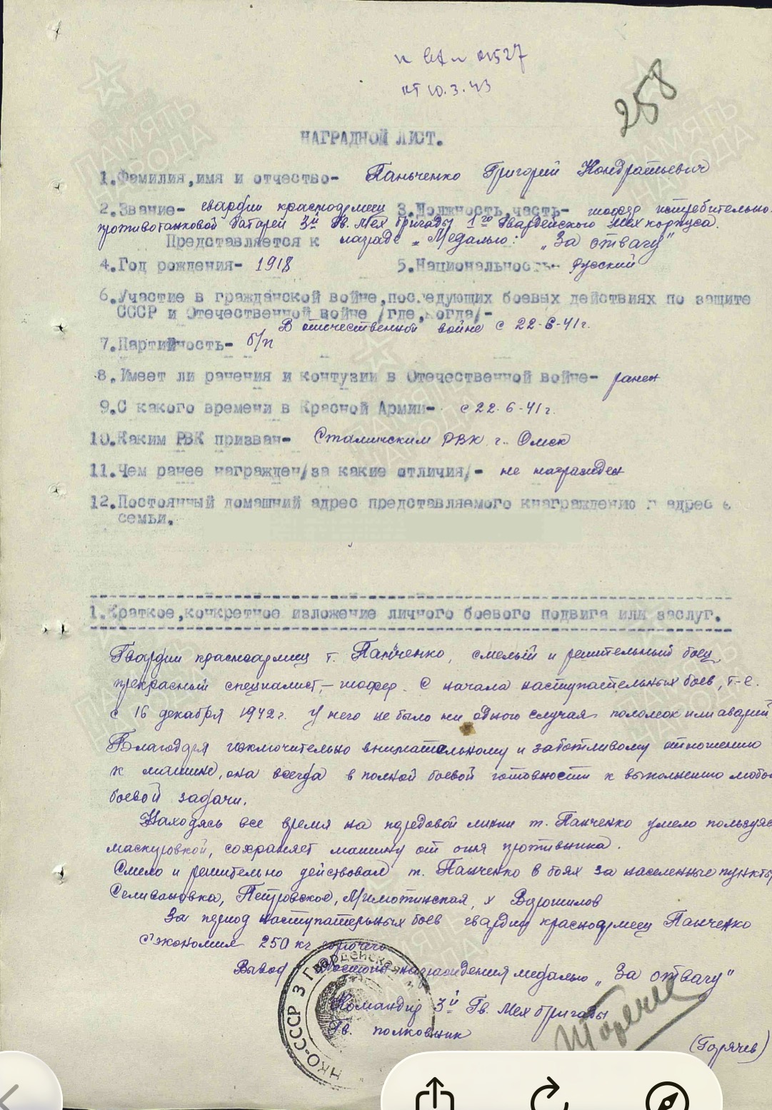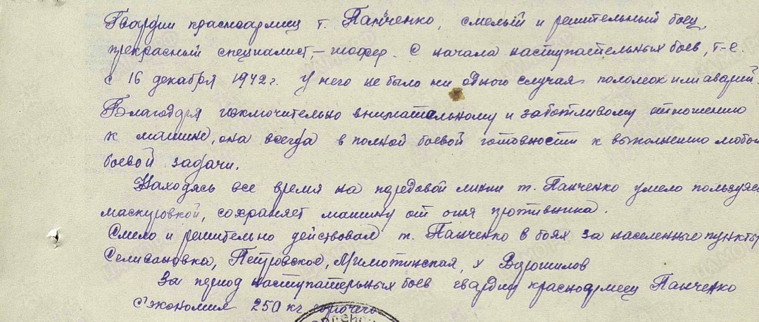 Панченко Григорий Кондратьевич во время ВОВ служил в механизированной бригаде , был шофёром . Доставлял грузы по «Дороге жизни» в блокадный Ленинград . «Дорога жизни» - это единственная военно - стратегическая транспортная магистраль , связывавшая во время Великой Отечественной Войны с сентября 1941 года по март 1943 года осаждённый немцами Ленинград с тылом страны . Проходила она через Ладожское озеро . Название «Дорога жизни», которое дали ленинградцы ледовой трассе - не поэтический образ . Это был единственный путь , позволивший поддерживать связь с Ленинградом . Дорога начала действовать в те дни , когда нормы продовольствия в городе были снижены до трагических 250 гр хлеба в сутки для рабочих и 125 гр для всех остальных , люди начали умирать от голода тысячами . Но даже для сохранения этих норм требовалось ежедневно не менее тысячи тонн продовольствия . Для спасения города и помощи фронту нужно было сделать невероятное : создать с нуля инфраструктуру , которая должна была бесперебойно действовать целую зиму , решая множество задач . Такой проект был очень сложной задачей для любого времени . Фактически это была победа науки , и прежде всего физики , над гитлеровской тактикой , использовавшей голод в качестве средства ведения войны . Две зимы подряд водители храбро отправлялись к другому побережью Ладоги , зная , что смерть пройдёт с ними в обе стороны дороги , не отставая ни на шаг . Спасая друг друга из-подо льда , рискуя оказаться в сковывающей насмерть воде , минуя удары противника и продираясь сквозь суровые ладожские просторы ,- такой ценой доставалось спасение жителей блокадного Ленинграда . И именно так достигалась победа жизни над смертью .