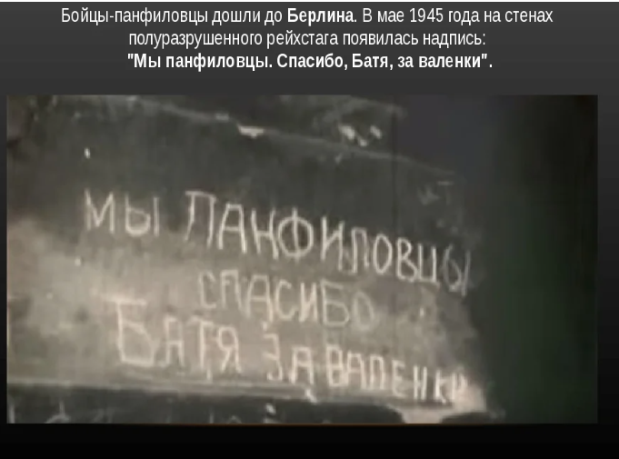 В 1945 году военные корреспонденты советских газет заметили на стенах поверженного рейхстага надписи: «Мы — панфиловцы. Спасибо, Батя, тебе за валенки».