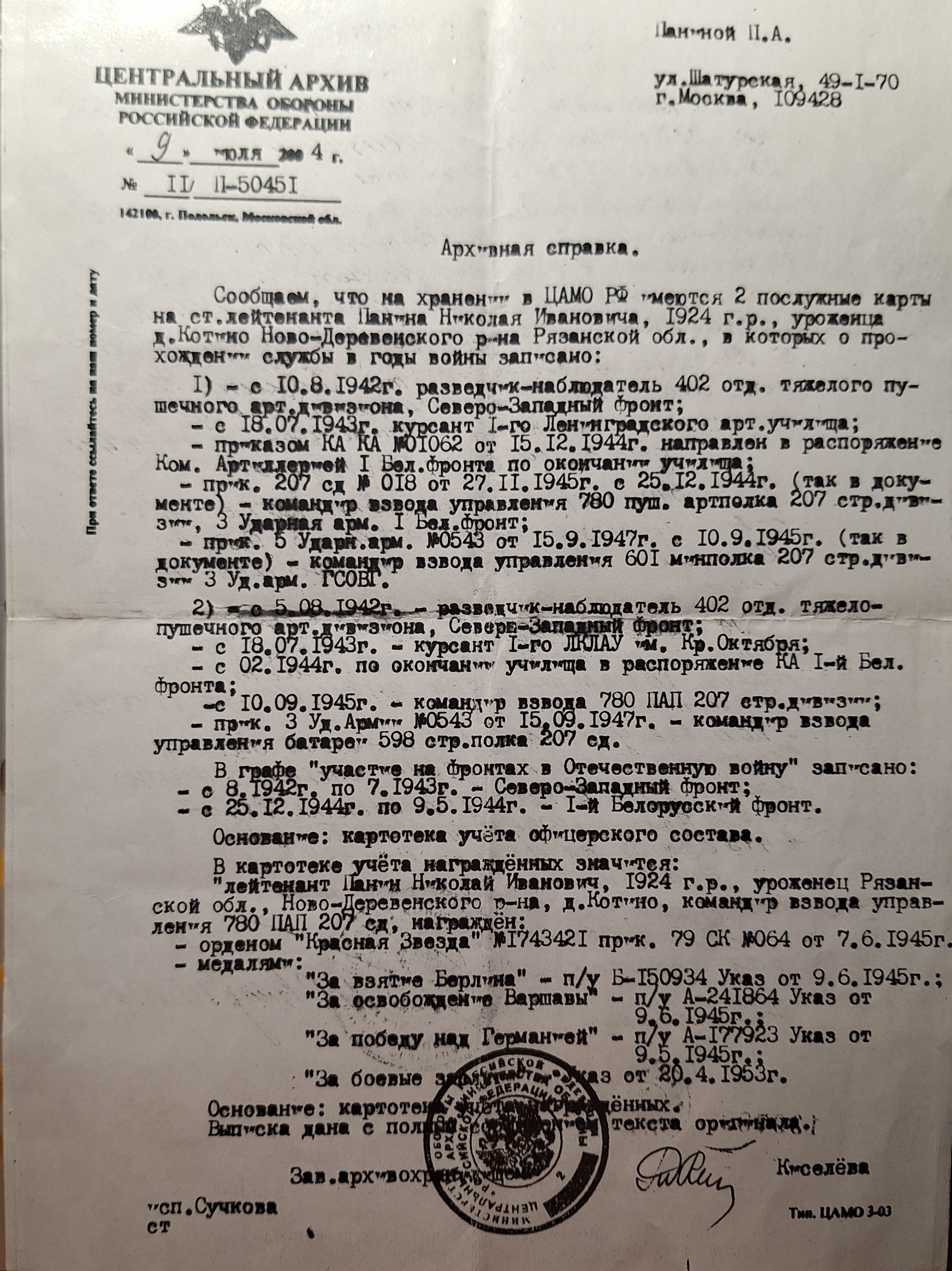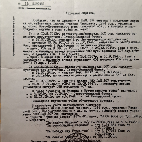1) - с 10.08.1942г разведчик-наблюдатель 402 отд. тяжелого пушечного арт.дивизиона, Северо-Западный фронт; - 18.07.1943г курсант 1-го Ленинградского арт.училища; - приказом КА КА №01062 от 15.12.1944г направлен в распоряжение Ком. Артиллерией 1 Белорусского фронта по окончании училища; - приказ.207 сд №018 от 27.11.1945г с 25.12.1944г (так в документе) - командир взвода управления 780 пуш. артполка 207 стр. дивизиона, 3 Ударная армия 1 Белорусский фронт; - прик. 5 Ударн.арм. №0543 от 15.09.1947г с 10.09.1945г (так в документе) - командир взвода управления 601 минполка 207 стр.дивизии 3 Уд.арм. ГСОВГ. 2) - с 05.08.1942г - разведчик-наблюдатель 402 отд. тяжелопушечного арт.дивизиона, Северо-Западный фронт; - с 18.07.1943г - курсант 1-го ЛКЛАУ им. Кр.Октября; - с 02.1944г по окончании училища в распоряжение КА 1-й Бел.фронта; - с 10.09.1945г - командир взвода 780 ПАП 207 стр.дивизии; - прик. 3 Уд.Армии №0543 от 15.09.1947г. - командир взвода управления батареи 598 стрелкого полка 207 ед. с 08.1942г по 07.1943 - Северо-Западный фронт; с 25.12.1944 по 09.05.1945 - 1-й Белорусский фронт.