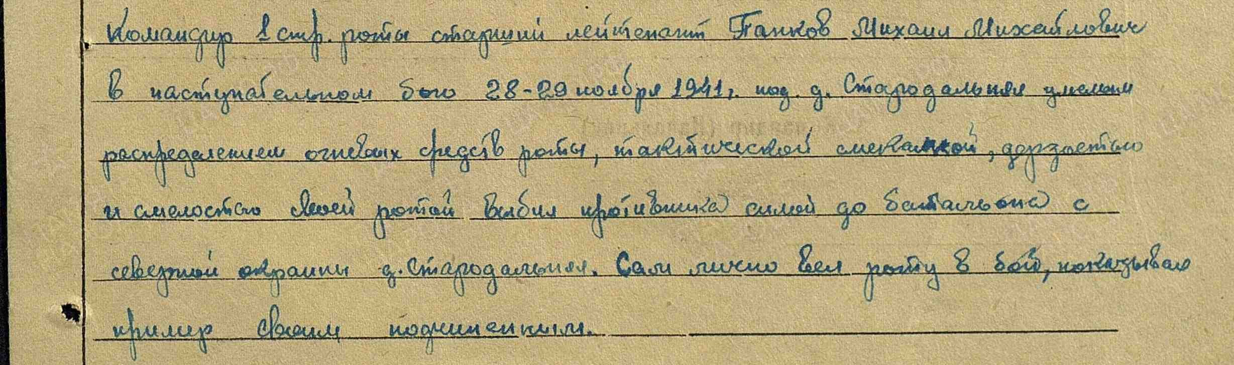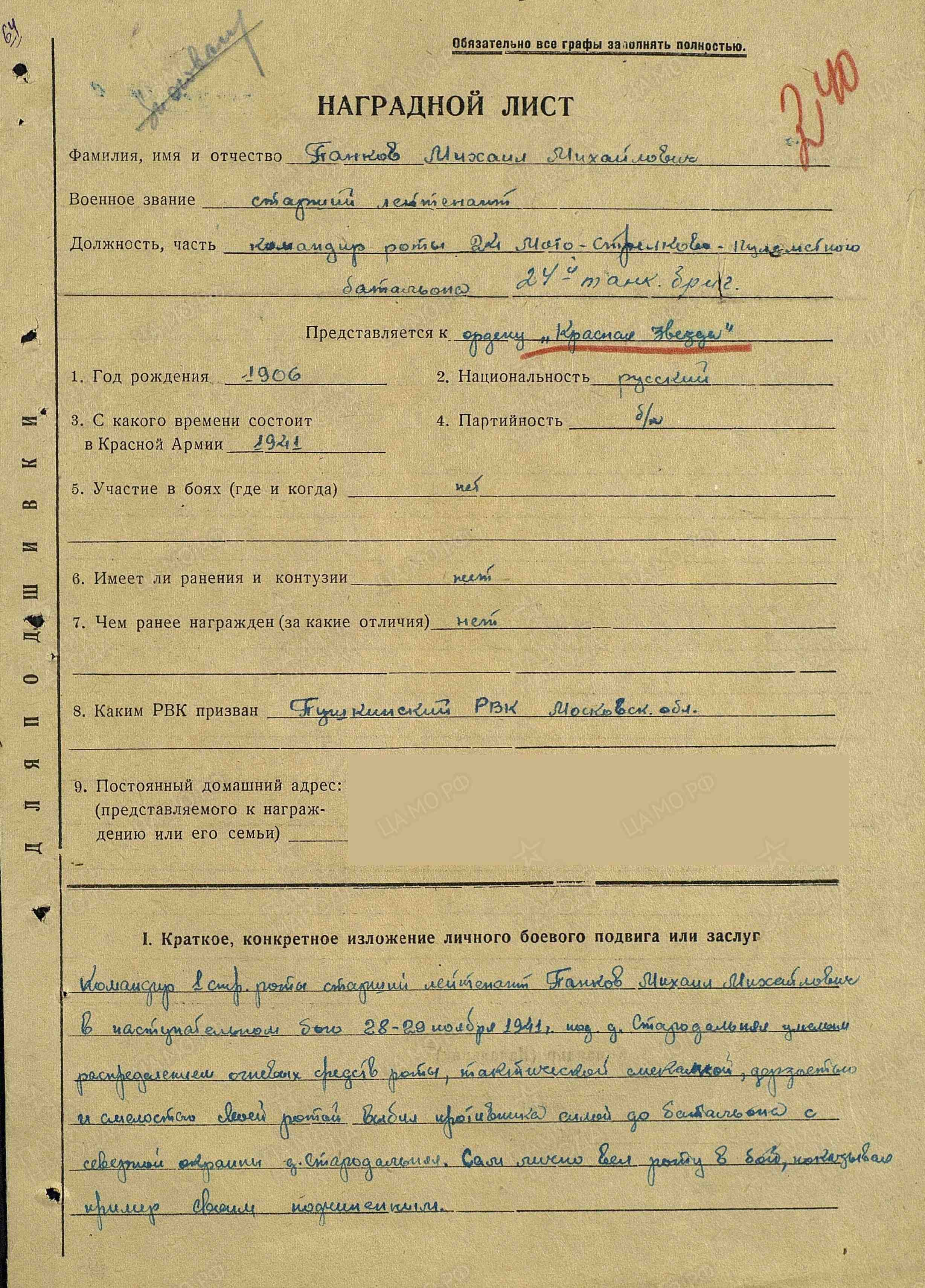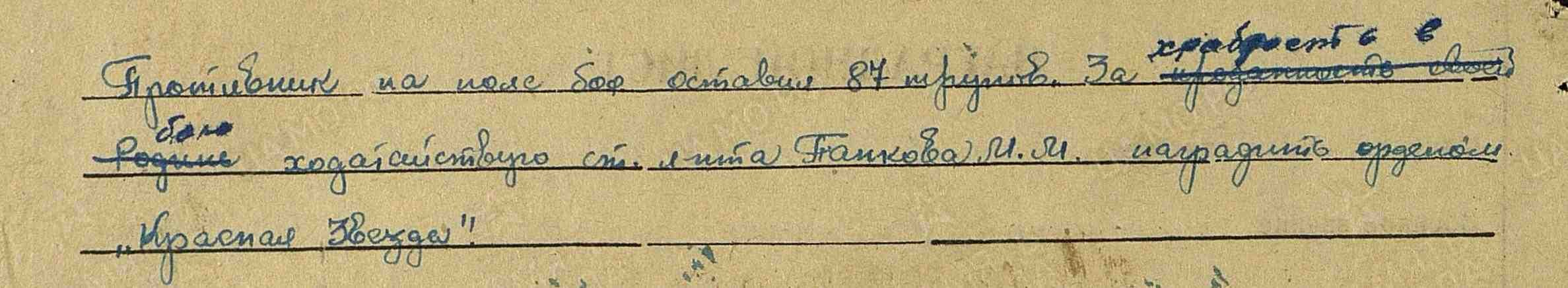 Мой дед - Панков Михаил Михайлович. Родом из города Астрахань. Старший из четырёх братьев. Михаил Михайлович и его младший брат Сергей не вернулись с войны. До войны проживал с семьёй в Московской области, Пушкинский р-н, г. Ивантеевка. Закончил в Москве текстильный институт. Был женат, имел дочь и сына.