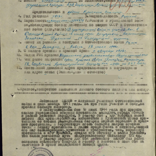 застрелил 3 гитлеровцев и 3 взял в плен. В наступательном бою 18 июля 1944 года