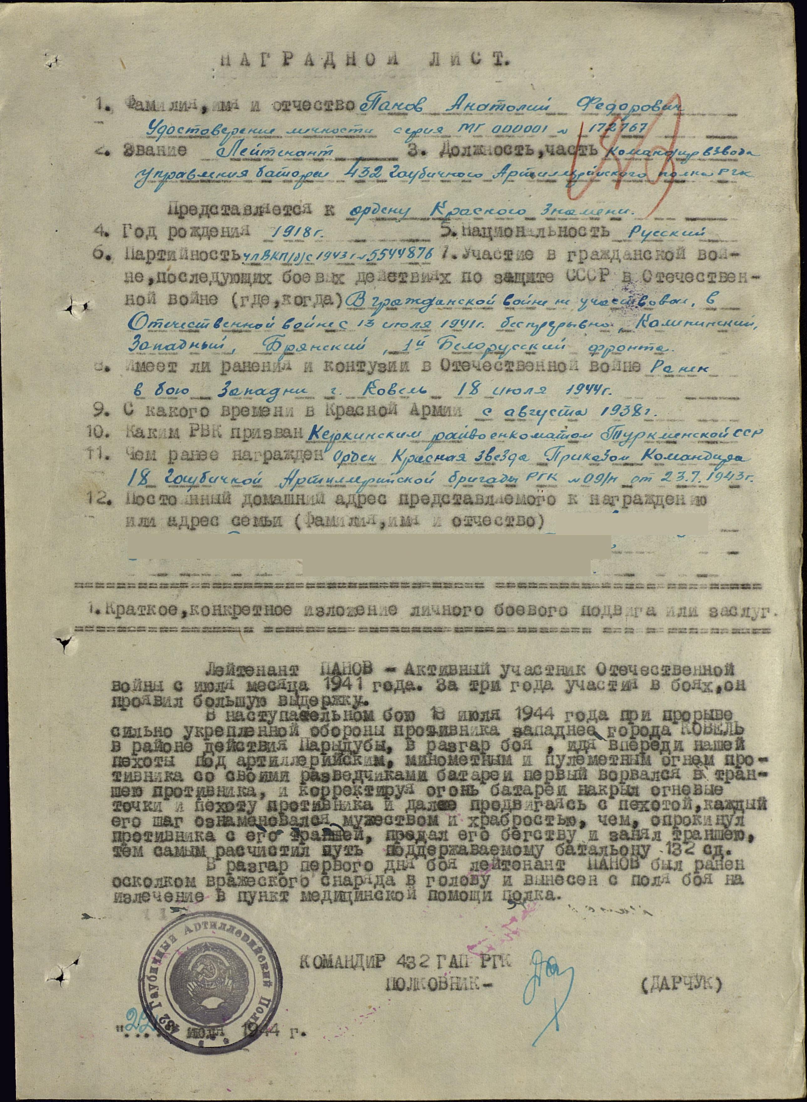 Панов был командиром взвода разведки артполка. Сражался в боях по освобождению