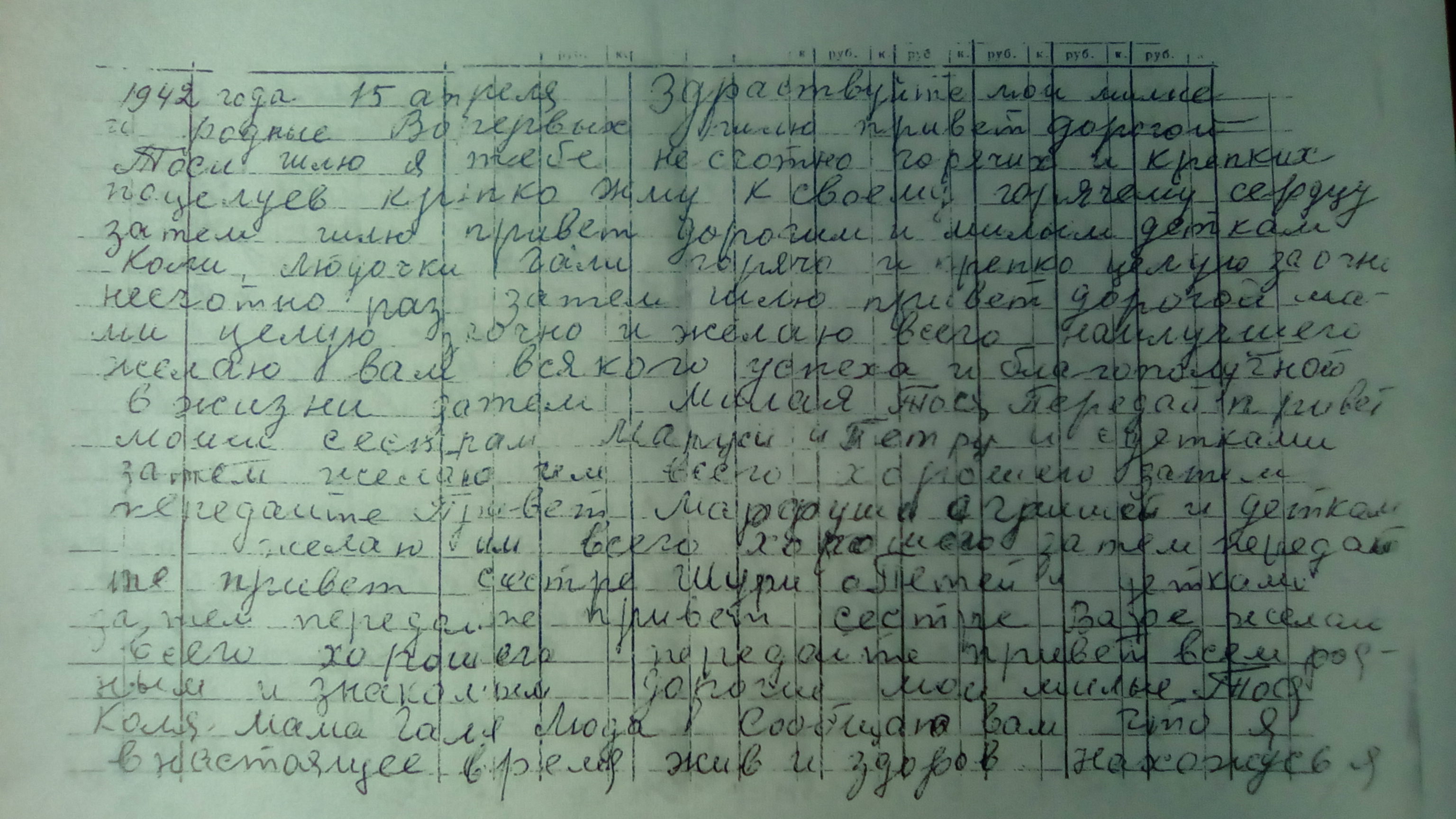 Это мой дедушка по маминой линии. Я его никогда не видела, слышала только отдельные рассказы о нем от своей бабушки - его жены, Панюхиной Антонины Петровны (1905-1989). Много из того уже не сохранилось в памяти, но одну, самую важную историю, я помню. Шли ожесточенные бои под Смоленском в 1942 году. Перед очередным наступлением, 15 апреля 1942 года, Степан написал письмо своей жене (оно представлено в фотоальбоме). Это письмо хранится в нашей семье и по сей день. С какой теплотой и любовью он обращается к жене и своим троим детям. К сожалению, в этом бою, за освобождение г. Велижа, 19.04.1942 г. мой дед погиб. Погиб очень нелепо, пожалев врага: в рукопашном бою он атаковал молодого немца, тот падая на колени на полу-русском, полу-немецком пытался объяснить, что он не виноват, и что у него дома маленький ребенок, дед опустил ружье и отпустил его на волю Божью, т.к. всегда помнил о своих детях...Через минуту был убит этим немцем ножом в спину....