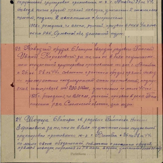 Патока Иван Кириллович родился в июле 1925 года. В апреле 1944 года был призван в ряды Советской армии. 1июля 1944 награждён медалью за отвагу: служив на юго-западе города Витебска, наводчиком орудия 6 батареи прямой наводкой, совместно с расчетчиком, при отражении неоднократных атак противника уничтожил не менее 40 человек.