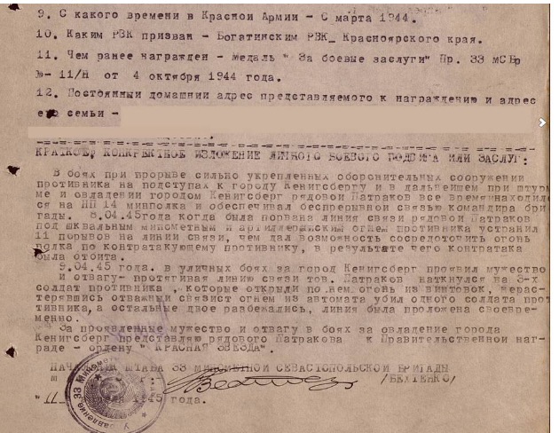 В боях, при прорыве сильно укрепленных оборонительных укрепленных сооружений противника на подступах к городу Кенигсбергу и, в дальнейшем, при штурме и овладении городом Кенигсберг, рядовой Патраков все время находился на НП 14 минполка и обеспечивал беспрерывной связью командира бригады.