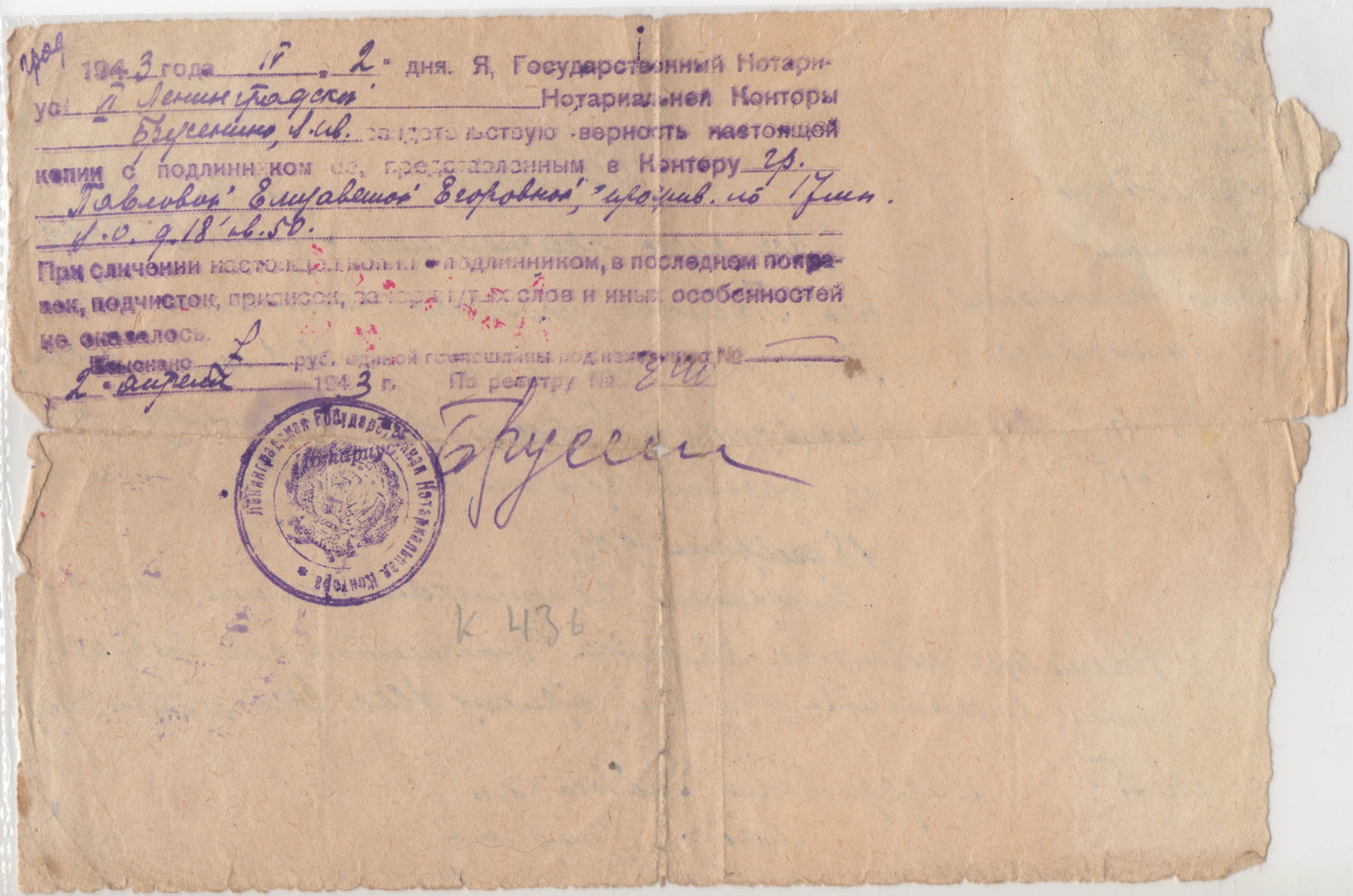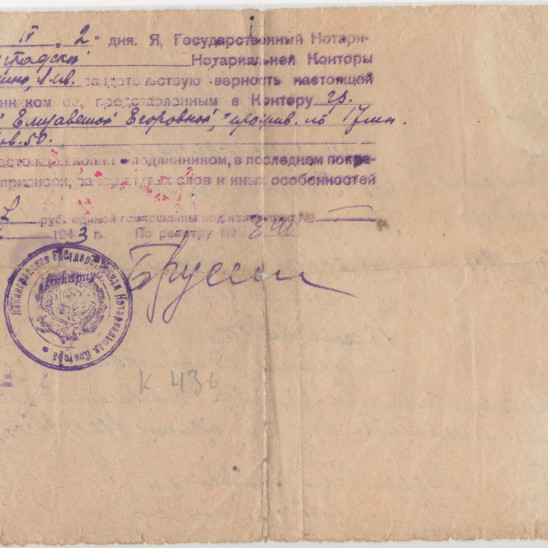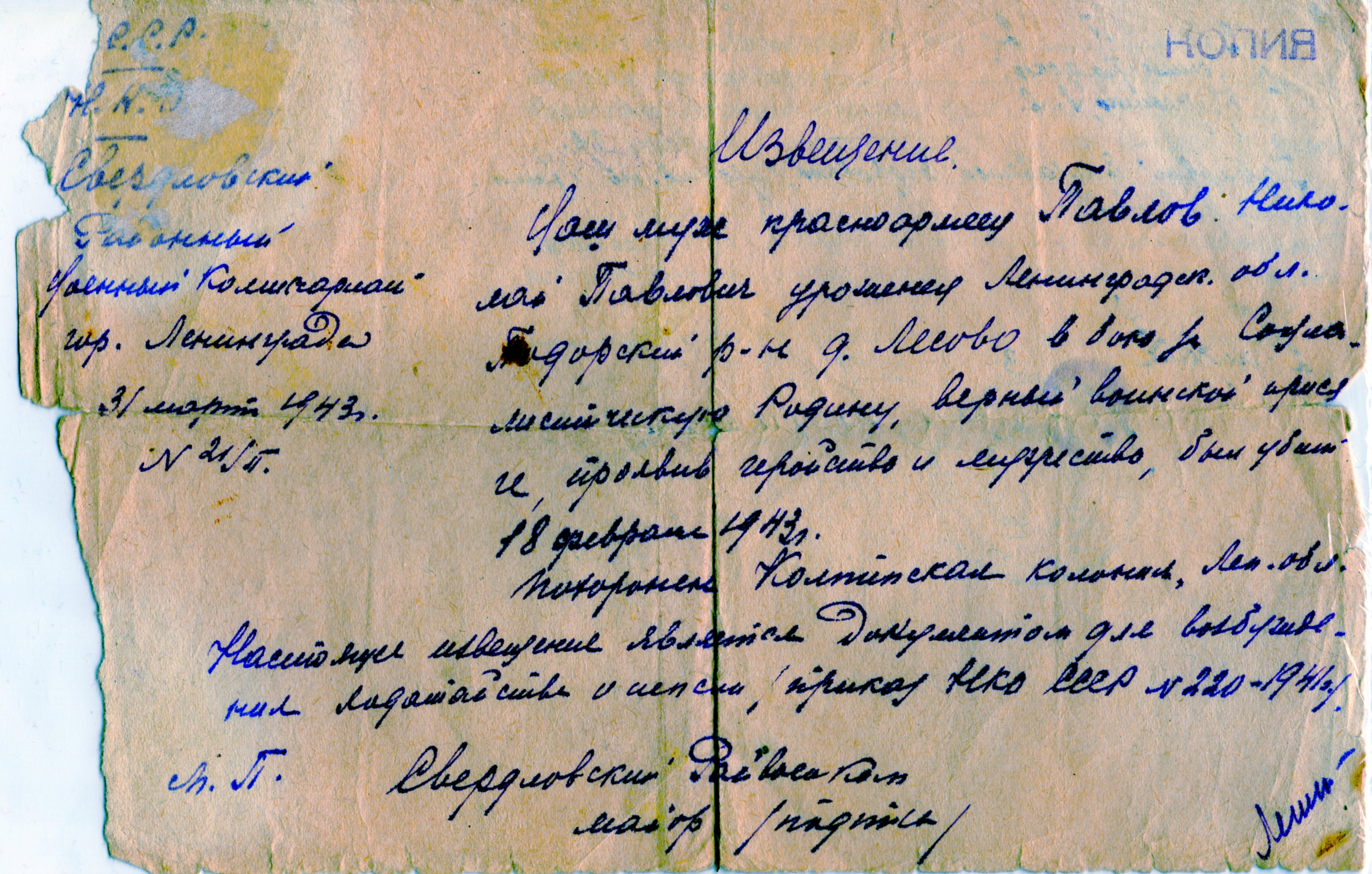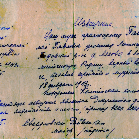 Мой дед по материнской линии Павлов Николай Павлович был призван в Ленинграде Свердловским РВК. Воевал под Ленинградом в районе Пушкина или Павловска (?) и погиб 18 февраля 1943 года. К сожалению больше мне ничего о нём не известно, так как моя бабушка, которая всю блокаду была в Ленинграде, очень мало рассказывала о нём и сохранила только 2-3 фотографии и похоронку. Она так и не смогла до конца своей жизни найти место захоронения своего мужа.