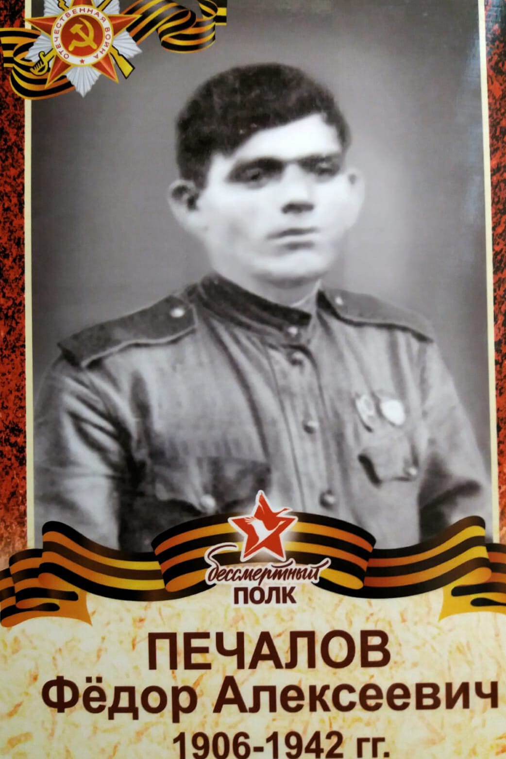 Фёдор Алексеевич родился в 1906г в с.Греческом, Минераловодского района, Ставропольского края. Окончил 3 класса школы. Работал учётчиком в селе. На момент призыва на фронт был женат, имел 4 детей. В 1941г был призван на фронт. В 1942г жене приходило извещение, что красноармеец Фёдор Алексеевич числится пропавшим безвести . До 1946г больше никакой информации не было. В 1946г согласно записям из Минераловодского военкомата Печалов Ф. А. погиб 09.07.1942г в Тверской области, Малотудского района, деревня Первомайская ,высота 300метров.