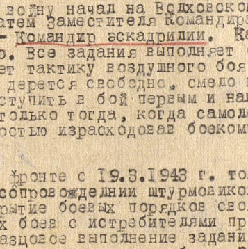 На Волховском фронте с 19 марта 1943-го года произвел 40 боевых вылетов на сопровождении штурмовиков и бомбардировщиков на разведку и прикрытие боевых порядков своих войск на поле боя.