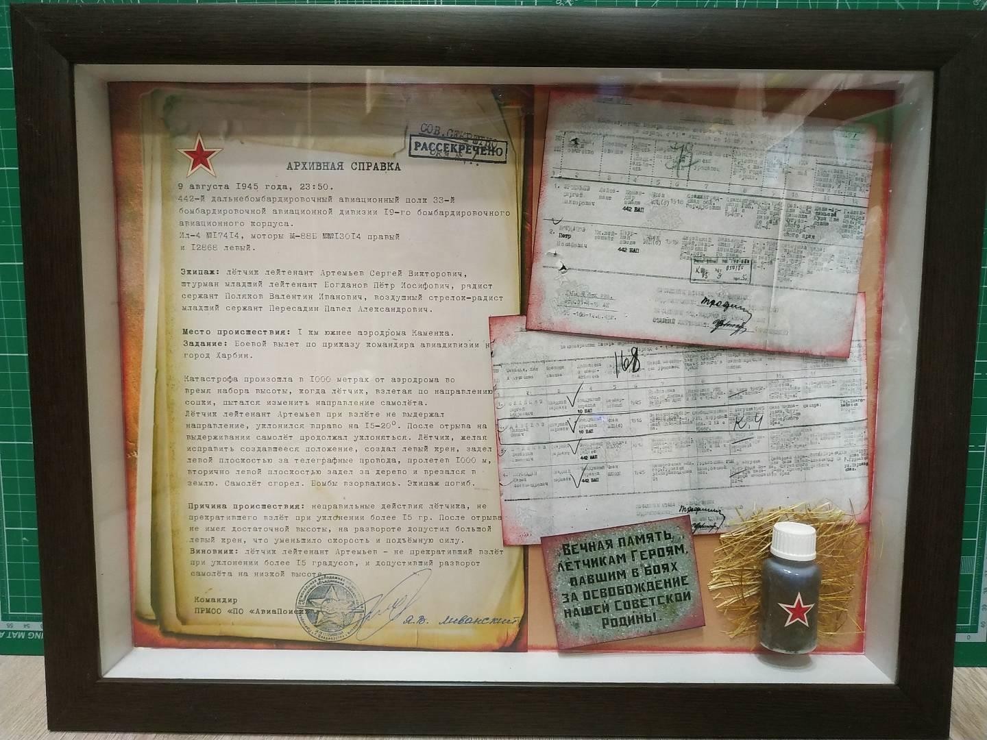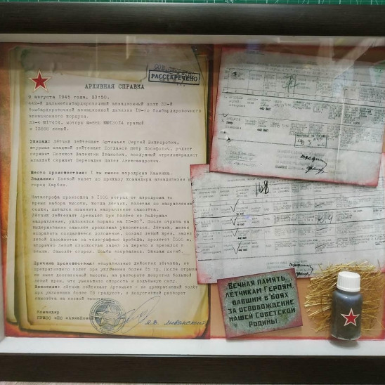 В мою семью реликвии были переданы в рамках торжественного открытия областного этапа Всероссийской акции «Вахта Памяти – 2021» в Кузбассе, которое состоялось 14 мая в городе Топки. Рамка с документами была вручена моей сестре. Сегодня она бережно хранится семейном архиве рядом с другими документами, рассказывающими о жизни моего героически погибшего деда.