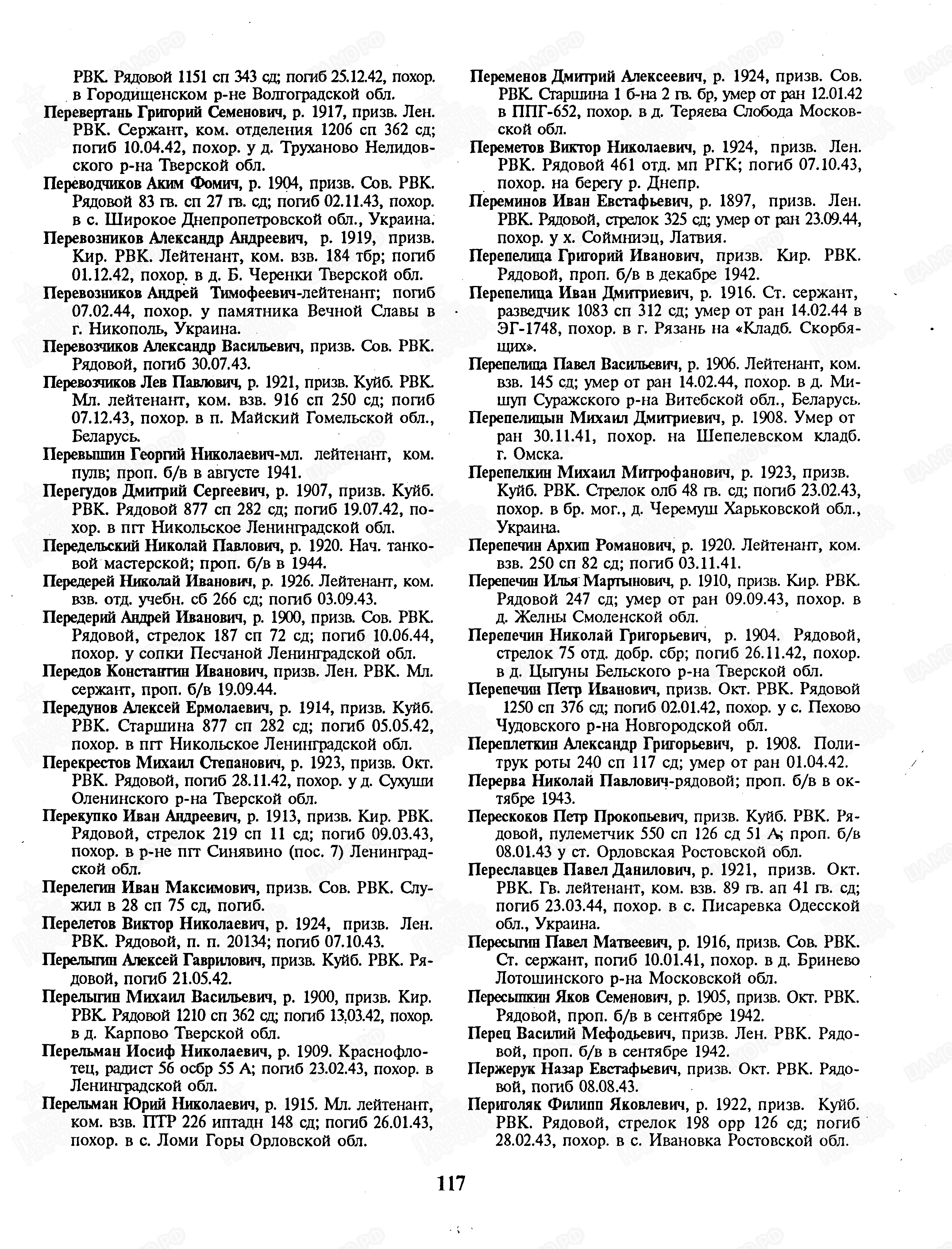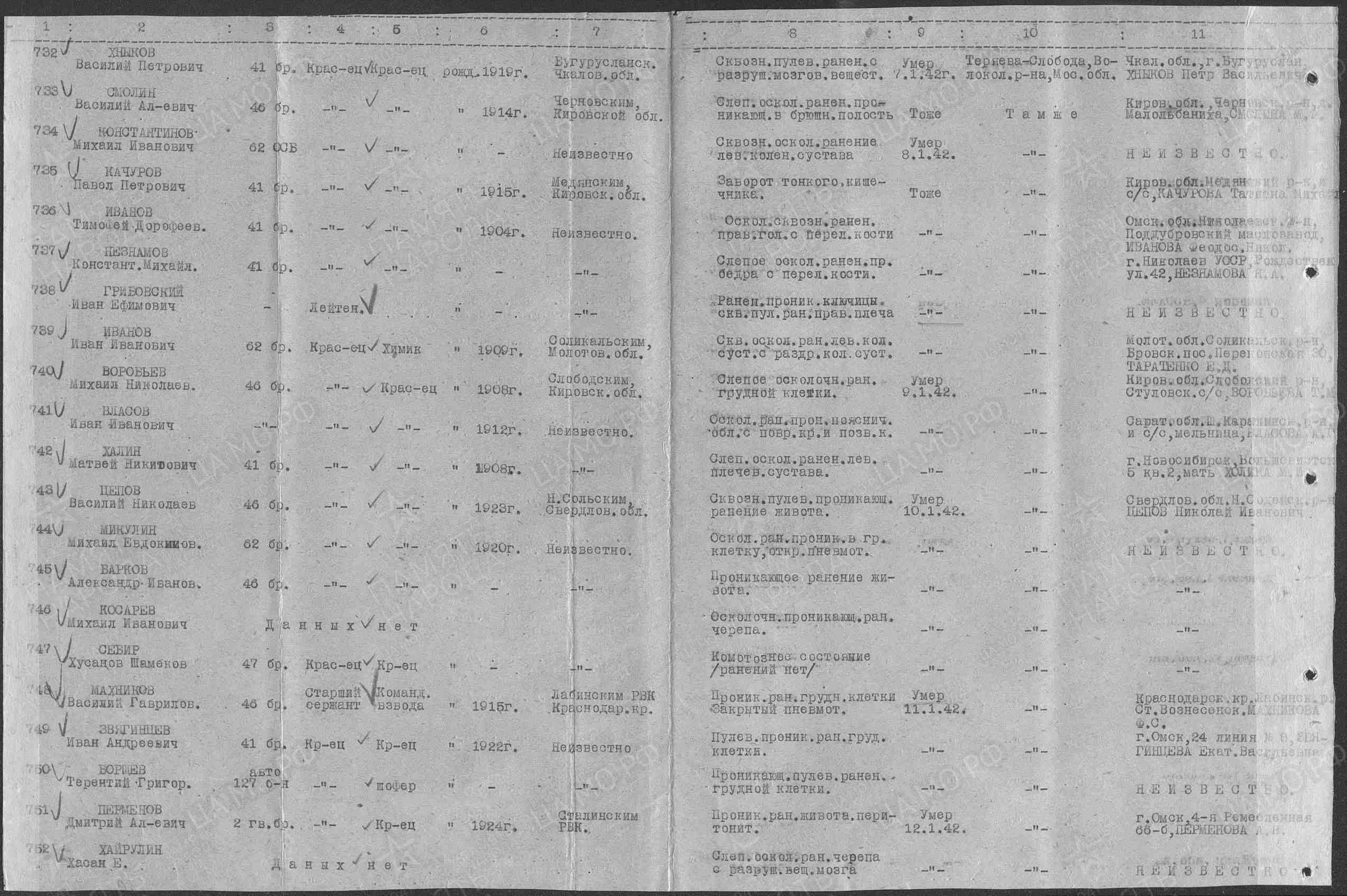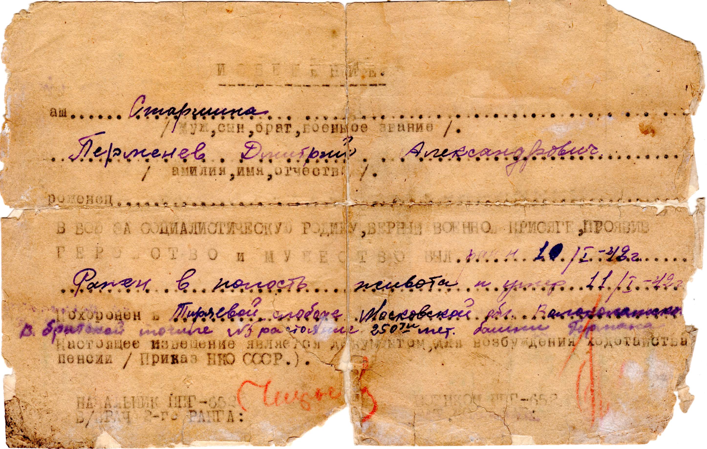 05.01.1942 От кого: Перменева Дмитрия Александровича Кому: родным Куда: г. Омск Текст письма Добрый день. Здравствуйте, дорогие родители. Шлю вам свой горячий привет с фронта. Шлю привет бабушке, маме, Шуре. Передайте большой сердечный привет Лели, … с их детками. Сейчас я нахожусь на фронте, бьем немца. Пока ему сейчас приходится на фронте … месяца. Первое боевое … получил 28 ноября днем часа в 2. Я прошу меня извинить, что долго не писал … писать было невозможно, да и времени не было. За этот месяц я вам написал одно письмо, не знаю дошло оно или нет. Я проезжал через Омск, но поезд стоял мало … нельзя было. Ну так будто бы писать больше нечего. На этом закругляюсь. Пока до свидания, жму руку, крепко целую, ваш сын Дмитрий. С Новым годом! Посылаю … и Шуре 20 р. … или писать. Послал бы больше, да потратил на разные безделушки. Комментарий: В память о погибшем сыне и брате, я назван моими дедом и мамой в его честь Дмитрием... Дмитрий Александрович Перменев 1924 г. После окончания школы подал документы, и через военкомат и Его направили учиться в Каспийское Военное Училище. Сфотографировался сам, и сделано Его фото с семьей. 05.01.1942г. Он находился проездом от места учебы на фронт и отправляет Это письмо родным Он призван в Армию на месте призыва с курсов Каспийского Военного Училища. 09.01.1942. Прибывает на Северо – Запад Московской области, на место формирования 1 Ударной Армии, и в её подчинении Он зачислен во 2-ую гвардейскую бригаду. Дислокация Его подразделения на правом фланге в районе с. Теряево Волоколамского района. 10.01.1942г. Начинается наступление. Его подразделение поднимается, в атаку и проходит при сильном пулемётно- минометном обстреле противника. Военврач ППГ-652 регистрирует Его ранение в полость живота. 11.01.42. Военврач регистрирует Его смерть от сепсиса. 12.01.1942г. Его хоронят в Братской могиле № 5 в 250 метрах от «Башни Германа» То есть Германовой Башни Иосифо-Волоцкого монастыря. Справка: (Германова башня расположена в центре западной крепостной стены). Была ошибка в донесении и запись в списке захороненных красноармейцев в Мемориале с той поры по наше время гласила другая - Перменов Дмитрий Алексеевич. Позже отчитаются, что в "Донесении о безвозвратных потерях запись бойцов при формировании в подразделениях могла вестись «на скорую руку» или «на коленке». В госпитале одна запись в похоронной команде при захоронении - другая. Всему народу было понятно одно, необходимо, как можно раньше остановить врага на «пороге Москвы», но и контратаковать противника. Сегодня мы ни кого не виним в ошибке, лишь скорбим о потере нашего Героя, но просим Вас увековечить правильное написание Его Фамилии и Отчества. Спасибо, работникам Теряевского сельсовета, что изучили документы и исправили ошибку. Теперь наши потомки имеют возможность увидеть, помнить и чтить своего родного человека, там - в Теряевском мемориале - Перменева Дмитрия Александровича. Имелась ошибка Фамилии и Отчества в записи Братского захоронения по адресу: Детгородковская ул. с. Теряево Теряевского сельского поселения Волоколамского района Московской области. Ошибка исправлена. А в мемориале МО РФ «Дорога Памяти» ошибка в фамилии и отчестве Нашего Героя не исправлена… Источник: Дмитрий Васильевич Веревкин 30 Апреля 2023 года Дмитрий Веревкин