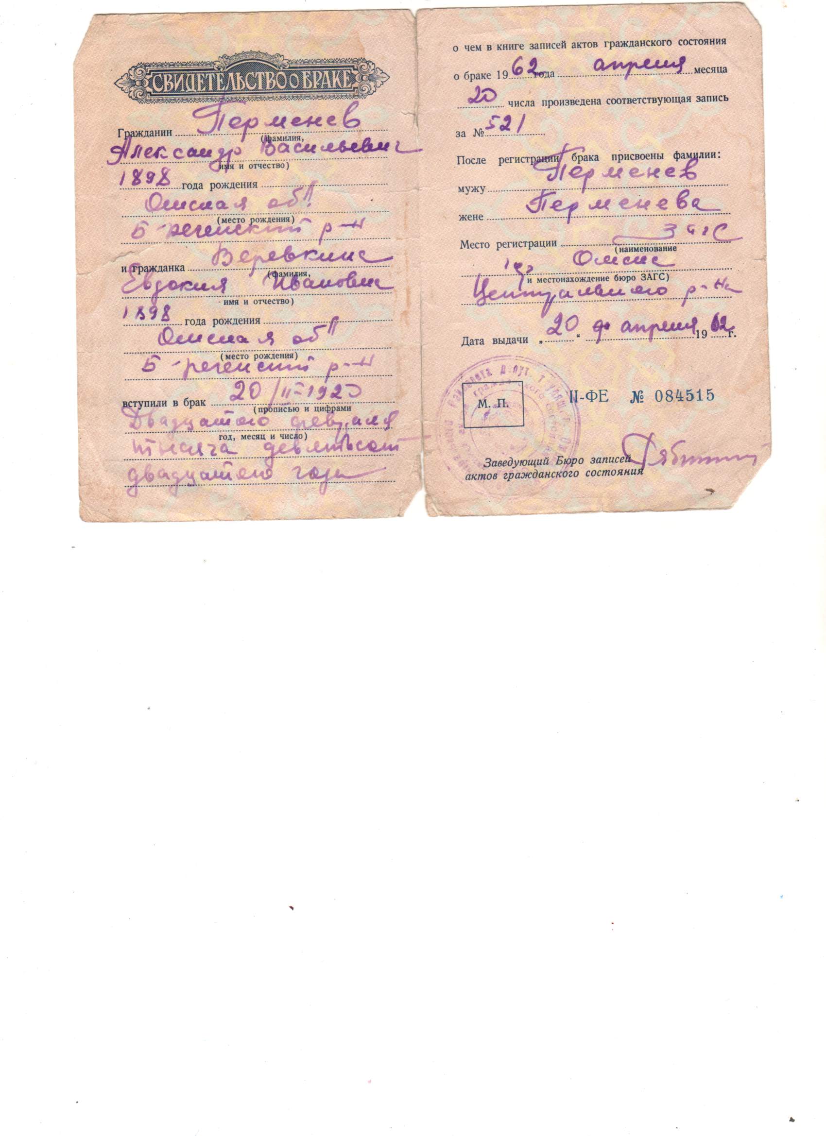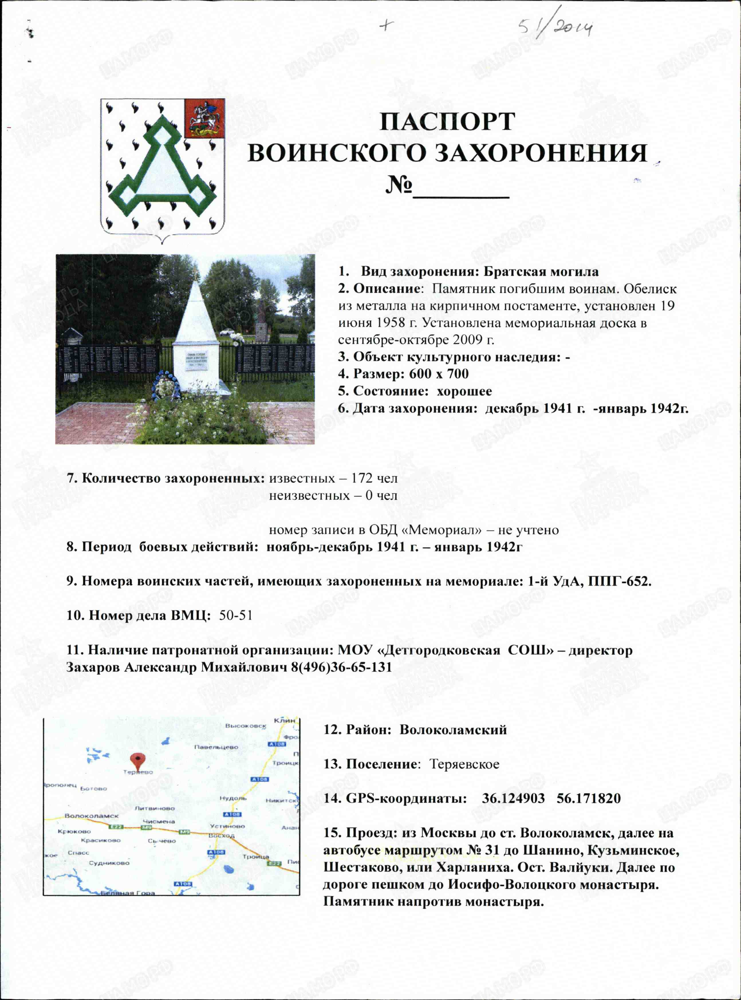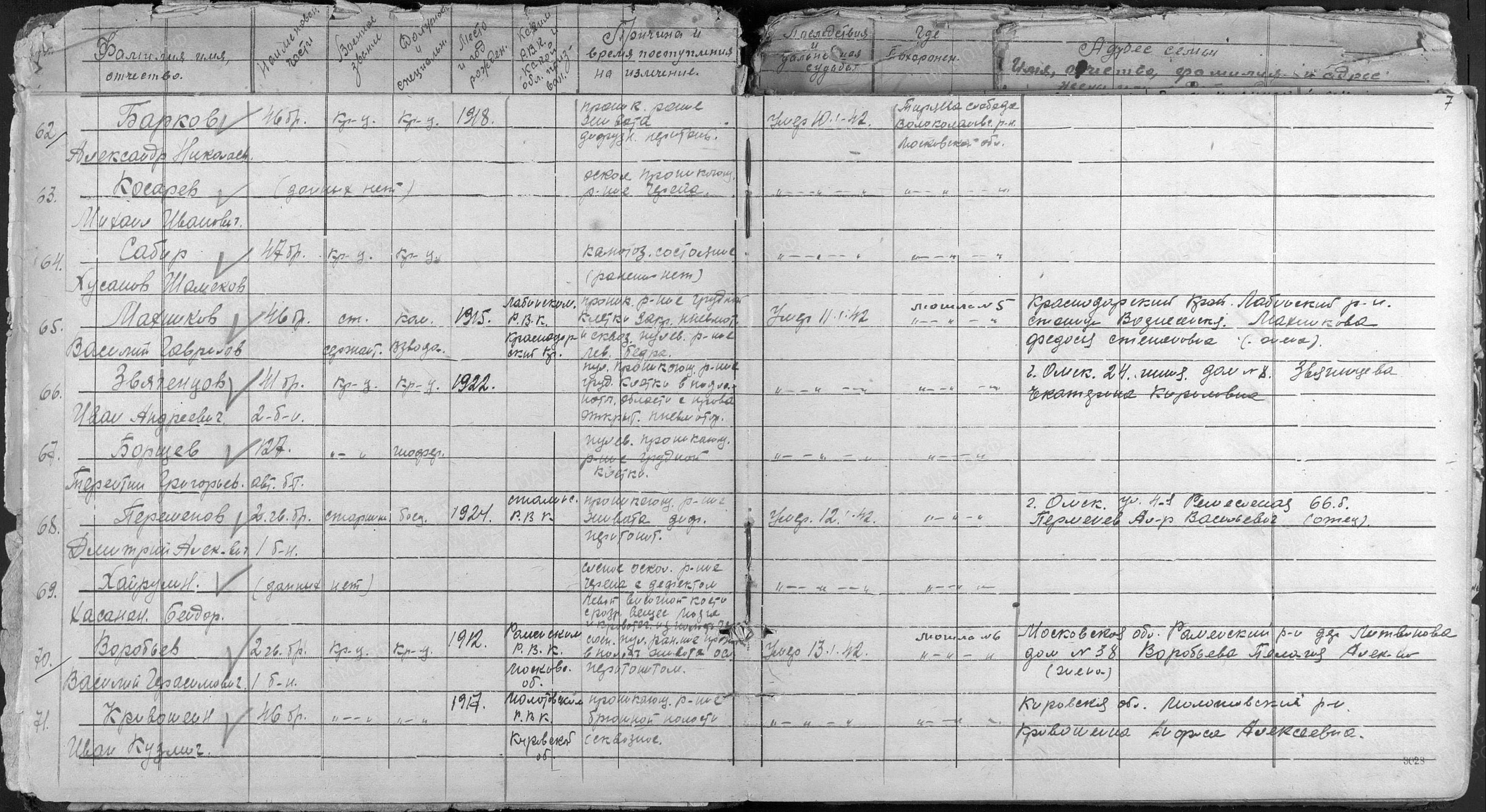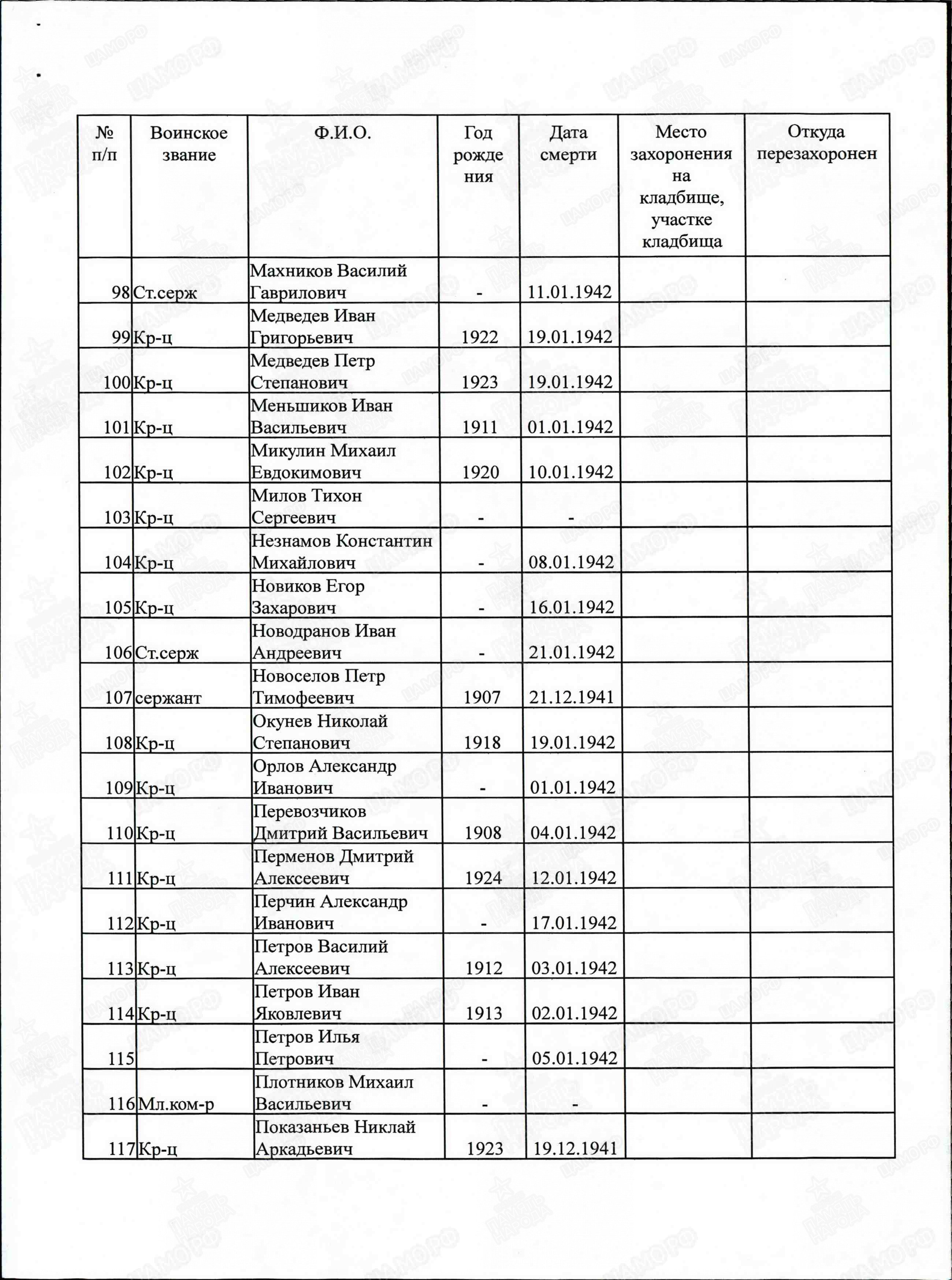 05.01.1942 От кого: Перменева Дмитрия Александровича Кому: родным Куда: г. Омск Текст письма Добрый день. Здравствуйте, дорогие родители. Шлю вам свой горячий привет с фронта. Шлю привет бабушке, маме, Шуре. Передайте большой сердечный привет Лели, … с их детками. Сейчас я нахожусь на фронте, бьем немца. Пока ему сейчас приходится на фронте … месяца. Первое боевое … получил 28 ноября днем часа в 2. Я прошу меня извинить, что долго не писал … писать было невозможно, да и времени не было. За этот месяц я вам написал одно письмо, не знаю дошло оно или нет. Я проезжал через Омск, но поезд стоял мало … нельзя было. Ну так будто бы писать больше нечего. На этом закругляюсь. Пока до свидания, жму руку, крепко целую, ваш сын Дмитрий. С Новым годом! Посылаю … и Шуре 20 р. … или писать. Послал бы больше, да потратил на разные безделушки. Комментарий: В память о погибшем сыне и брате, я назван моими дедом и мамой в его честь Дмитрием... Дмитрий Александрович Перменев 1924 г. После окончания школы подал документы, и через военкомат и Его направили учиться в Каспийское Военное Училище. Сфотографировался сам, и сделано Его фото с семьей. 05.01.1942г. Он находился проездом от места учебы на фронт и отправляет Это письмо родным Он призван в Армию на месте призыва с курсов Каспийского Военного Училища. 09.01.1942. Прибывает на Северо – Запад Московской области, на место формирования 1 Ударной Армии, и в её подчинении Он зачислен во 2-ую гвардейскую бригаду. Дислокация Его подразделения на правом фланге в районе с. Теряево Волоколамского района. 10.01.1942г. Начинается наступление. Его подразделение поднимается, в атаку и проходит при сильном пулемётно- минометном обстреле противника. Военврач ППГ-652 регистрирует Его ранение в полость живота. 11.01.42. Военврач регистрирует Его смерть от сепсиса. 12.01.1942г. Его хоронят в Братской могиле № 5 в 250 метрах от «Башни Германа» То есть Германовой Башни Иосифо-Волоцкого монастыря. Справка: (Германова башня расположена в центре западной крепостной стены). Была ошибка в донесении и запись в списке захороненных красноармейцев в Мемориале с той поры по наше время гласила другая - Перменов Дмитрий Алексеевич. Позже отчитаются, что в "Донесении о безвозвратных потерях запись бойцов при формировании в подразделениях могла вестись «на скорую руку» или «на коленке». В госпитале одна запись в похоронной команде при захоронении - другая. Всему народу было понятно одно, необходимо, как можно раньше остановить врага на «пороге Москвы», но и контратаковать противника. Сегодня мы ни кого не виним в ошибке, лишь скорбим о потере нашего Героя, но просим Вас увековечить правильное написание Его Фамилии и Отчества. Спасибо, работникам Теряевского сельсовета, что изучили документы и исправили ошибку. Теперь наши потомки имеют возможность увидеть, помнить и чтить своего родного человека, там - в Теряевском мемориале - Перменева Дмитрия Александровича. Имелась ошибка Фамилии и Отчества в записи Братского захоронения по адресу: Детгородковская ул. с. Теряево Теряевского сельского поселения Волоколамского района Московской области. Ошибка исправлена. А в мемориале МО РФ «Дорога Памяти» ошибка в фамилии и отчестве Нашего Героя не исправлена… Источник: Дмитрий Васильевич Веревкин 30 Апреля 2023 года Дмитрий Веревкин