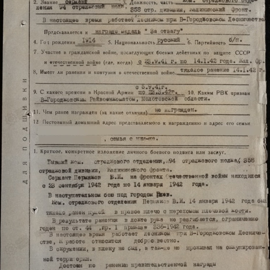 Пермяков Василий Иванович родился в 1914 г. Участник Великой Отечественной войны. Звание сержант командир стрелкового отделения 94 стрелковый полк 358 стрелковая дивизия. Калининский фронт. На фронте он находился с 23 сентября 1941года по 14 января 1942 года. В наступательном бою под городом Ржев был тяжело ранен пулей в правое плечо с переломом плечевой кости. В результате ранения в локте рука не разгибается. Награжден, согласно наградному листу медалью "За отвагу". Но скорее всего награжден Медалью «За боевые заслуги» Приказ подразделения №: 223/148 от: 06.11.1947 Издан: Президиум ВС СССР. После ранения работал лесником В- Городковском лесничестве.