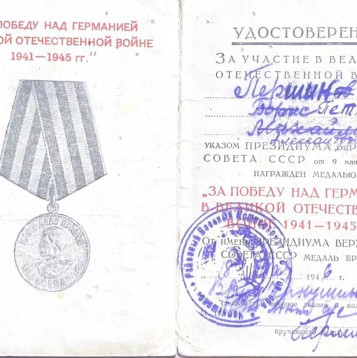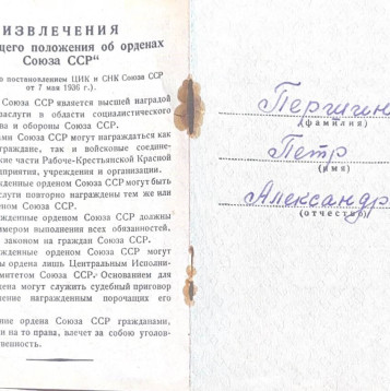 Першин Петр Александрович родился 23 сентября 1913 года в деревне Лысая Гора, Чернушинского района, Пермской губернии. В 1930 году закончил 7 классов Рябковской средней школы и поступил на курсы при Сарапульском педагогическим техникуме. С октября 1930 года по октябрь 1937 года – студент Пермского рабочего факультета, учитель седьмой Таушинской школы Чернушинского района. С октября 1937 по декабрь 1940 года – служба в РККА (участвовал в советско – финской войне). С октября 1941 по 28 августа 1945 года – учувствовал в ВОВ, демобилизовался в звании старшего лейтенанта по инвалидности. Во время войны воевал на передовой, два раза был в госпитале, первый раз был ранен в руку, второй раз в ногу. Ранение в ногу было очень тяжелым, из-за этого ее даже хотели ампутировать, но, советские врачи сумели ее спасти. Солдаты его подразделения вспоминали, что Петр Александрович всегда заботился о своих подчиненных, наставлял молодых бойцов, чтобы были осторожными, не лезли на рожон, давал житейские и военные советы. Когда было свободное время, то писал домой письма, писал всегда с оптимизмом, что все будет хорошо и мы обязательно победим! После войны работал на разных должностях, преподавал в школе. Про войну рассказывать не любил, говорил, что дело это очень нехорошее. Из-за полученных ранений прожил не долго, умер в октябре 1961 года в возрасте 48 лет. Награды сохранились не все, так как в доме была совершена кража и часть наград были украдены.
