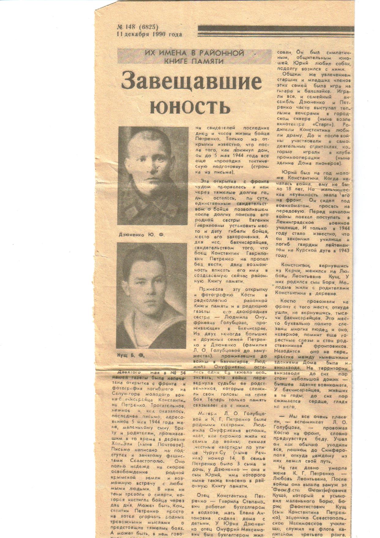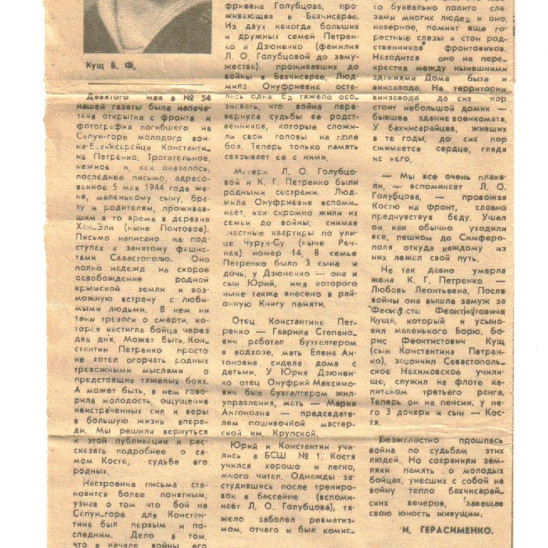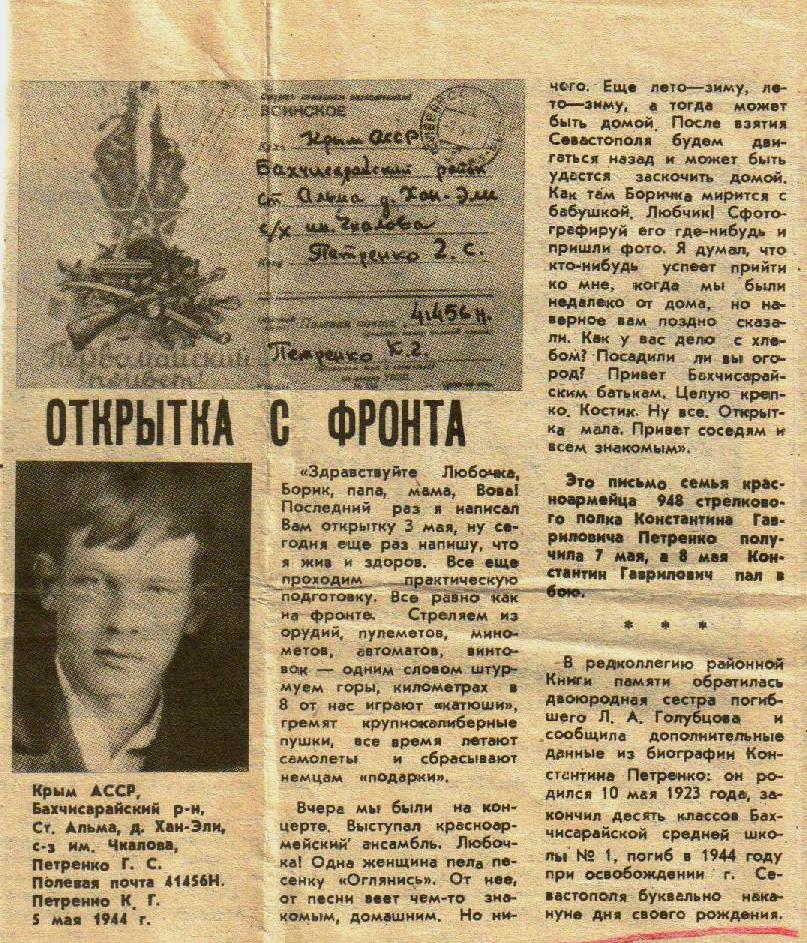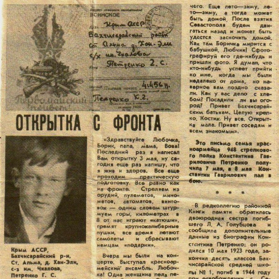 У нас сохранилась статья из газеты "Слава труду" от 9 мая 1990 г., где напечатана та самая последняя открытка с