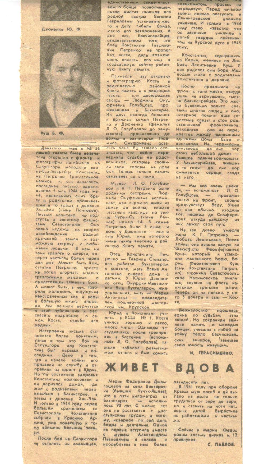 мая, он погибпри штурме Сапун-горы, защищая Севастополь. Сейчас на Сапун-горе живёт со своей семьёй его