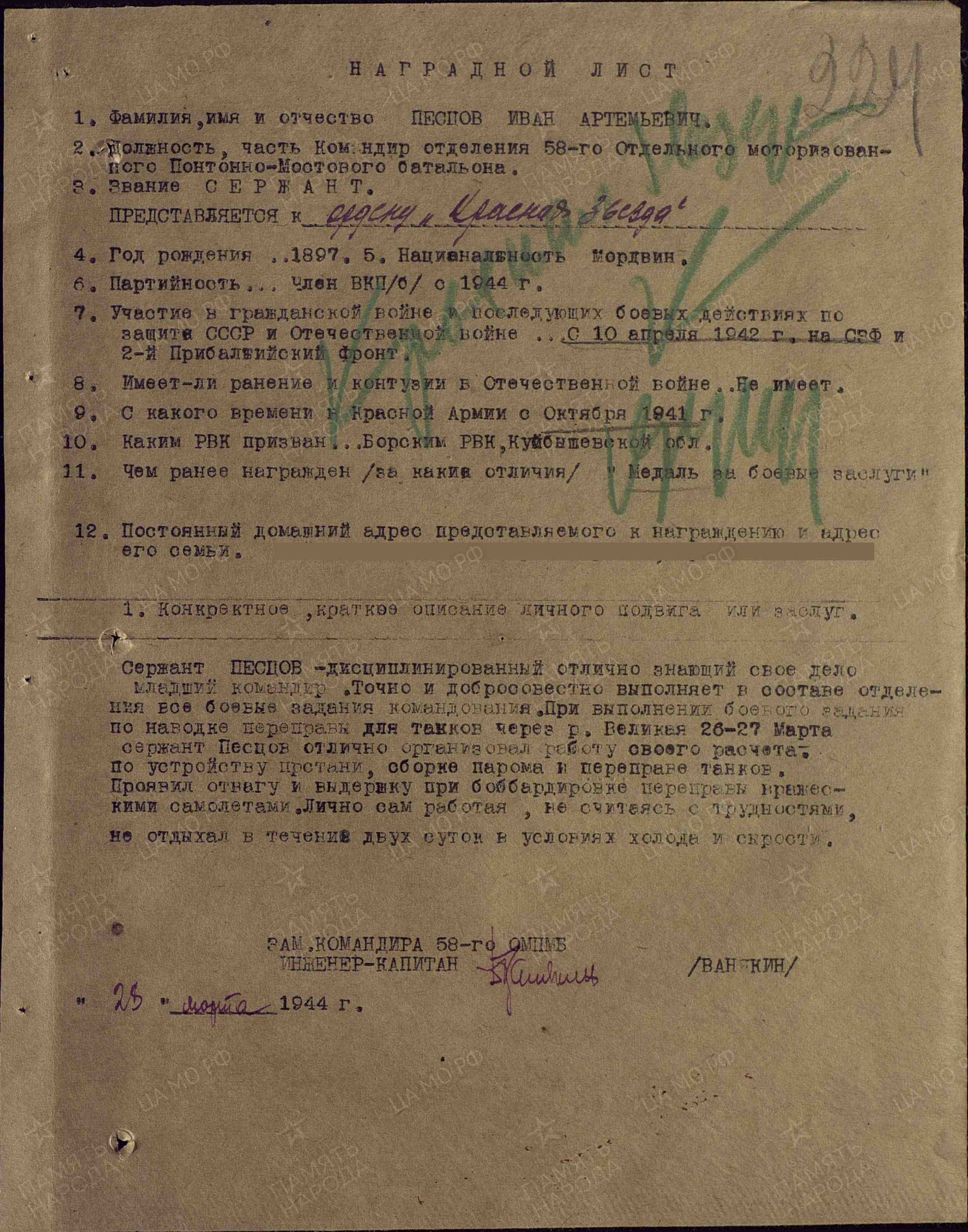 Писцов Иван Артемьевич-гв.сержант, помкомвзвода 58-го Отдельного Понтонно-Мостового б-на 12-го Гв.СК С-З фронта. В ВОВ с 10.41г. На устройстве оборонительных рубежей выполнял норму выработки на 250-300 %. За короткое время сорудил паром из подручных средств и переправил много живой силы и другой амуниции. Приказом комбата майора Сафарова награжден медалью "За Боевые Заслуги" от 02.07.43г по 12 Гв.СК Северо-Западного фронта. При выполнение боевого задания по наводке переправы для танков через реку Великая 26-27 марта отлично организовал работу своего расчета по устройству пристани, сборке парома и переправы танков. По приказу командира 58-го ОПМБ капитана Ванякина награжден орденом "Красной Звезды" от 22.04.44г. Награжден медалью "За Победу над Германией". Наградной в архиве. Участник Гражданской войны с 1918г по 1920 год. Этот фронтовик мой односельчанин. Умер в 1982г.с.Коноваловка
