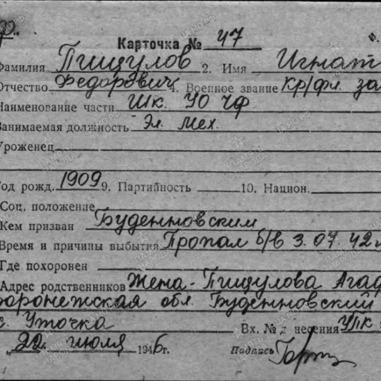 Пищулов Игнат Федорович пошел на фронт в 32 года. В его родной деревне Уточке его остались дожидаться жена и трое детей. По редким письмам родные узнали, что Игнат Федорович служит на берегу Черного моря. Дальнейшая его история была тесно связана с объединенной школой Учебного отряда Черноморского флота и бронебашенной береговой батареей №35, которая начиная с 30 июня 1942 года являлась последним наиболее устойчивым узлом сопротивления на подступах к Херсонесскому полуострову. 3 июля 1942 года в боях за Севастополь Пищулов Игнат Федорович пропал без вести.На стенах музейного историко-мемориального комплекса героическим защитникам Севастополя «35-я береговая батарея» навечно высечено его имя.