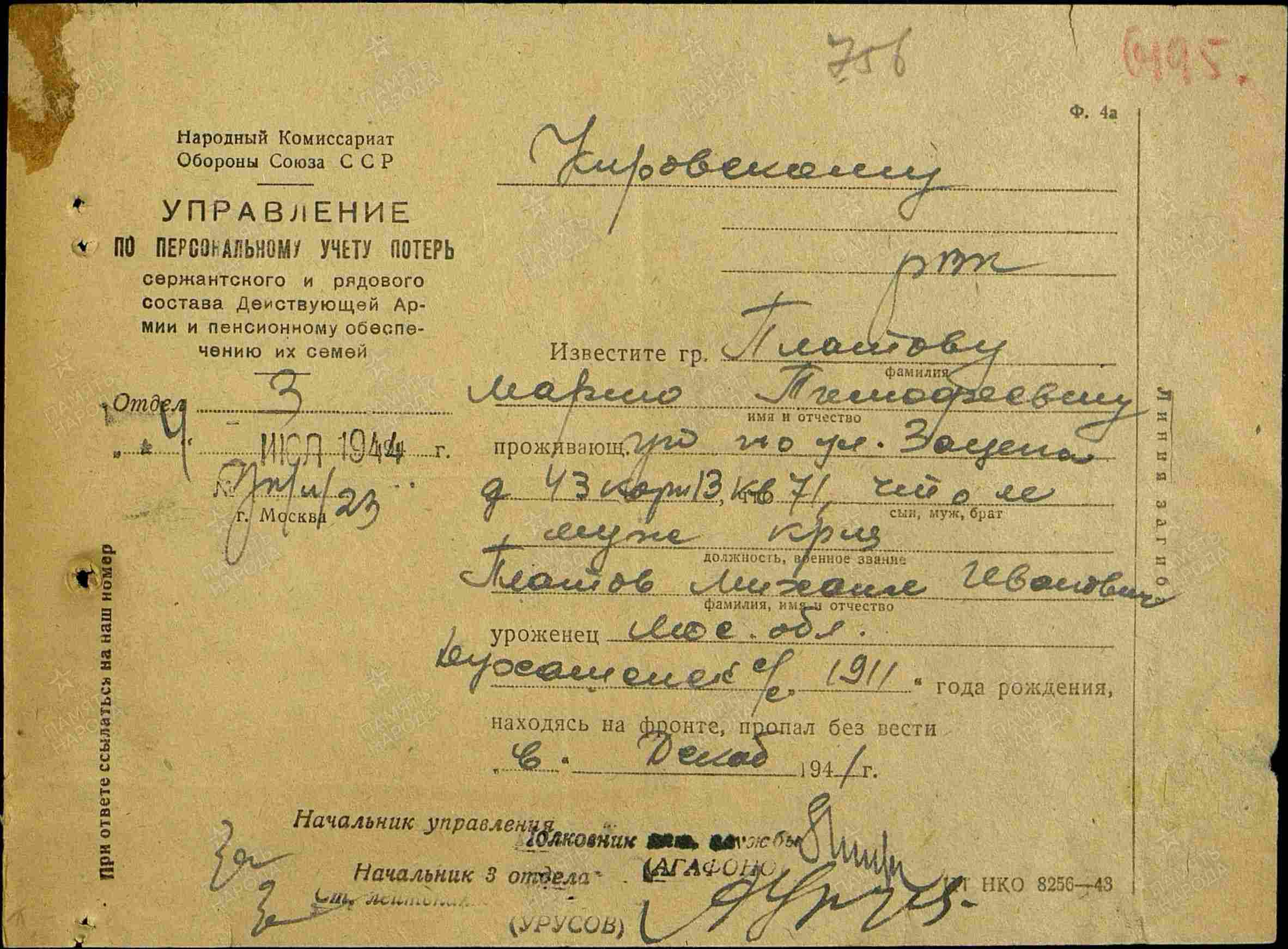 Моя прабабушка Мария родилась в 1904 году в Московской области в семье железнодорожника Ивана Ивановича Панферова. Детство прошло в Подмосковье, в Можайском районе. В 1920-е годы Мария Ивановна переехала в Москву на работу на железную дорогу и вышла замуж за Михаила Ивановича Платова, который тоже работал на железной дороге и был призван на войну. Накануне войны работала на одной из швейных фабрик города Москвы и имела специальность закройщицы. Во время войны на этой фабрике шили шинели.