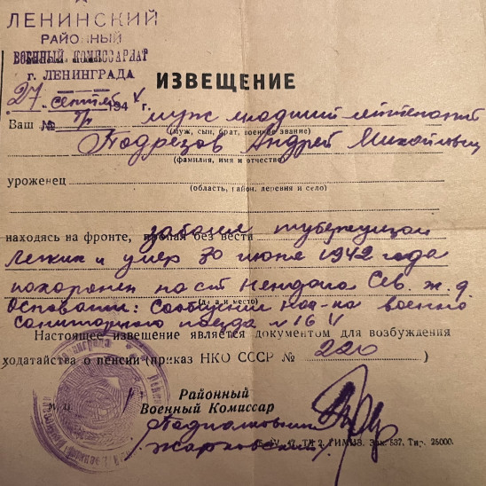 По профессии - учитель. Родился в Петербурге; в конце 1920-х гг. учительствовал на Каргополье Архангельской области, в селе Тихманьга; позднее - в Ленинграде. Воинское звание - младший лейтенант. В июне 1941г. был мобилизован Ленинским Районным Военным Комиссариатом г. Ленинграда. Воевал на Северо-Западном фронте в артиллерийских войсках - командир расчета. В семье сохранились его письма первых месяцев войны. Вот выдержки: “Смерти я не боюсь. Собираюсь вернуться домой с победой.” Маленькой дочке Тане: “Разобьем гадов, кончится война, и папа снова будет дома. Тогда мы с тобой заживем весело, снова так же, как и прежде жили… Пиши о нашем доме, о Ленинграде… Будем верить, что скоро увидим друг друга”. Свидеться не пришлось. Госпиталь, в котором находился на излечении мл. лейтенант Подрезов А.М., летом 42-го года эвакуировали из Архангельска в глубокий тыл, и он скончался в дороге в военно-санитарном поезде 30.06.1942г. Похоронен в общей братской могиле на ж.д. станции Няндома Северной железной дороги. Всего в 80км от г. Каргополя, где, волею судеб, он воспитывался в детском доме со своим младшим братом, 5-летним Ваней (родители умерли в Петербурге перед Первой мировой войной), и в 120км от села Тихманьга, где он начинал свою педагогическую деятельность в конце 20-х гг. прошлого века. Несколько лет спустя после войны в Тихманьге на одном из митингов, посвященных Дню Победы (в которую он свято верил), выступал Герой Советского Союза Докучаев Николай Егорович, его бывший ученик. Герой начал свое выступление словами: “Путевку в жизнь мне дал Подрезов Андрей Михайлович”.