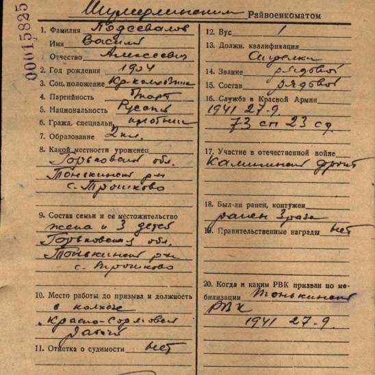 Боевой путь ветерана Подсевалов Василий Алексеевич 1904 г. о. Место рождения Горьковская обл., Тонкинский р-н, с. Трошкова Дата и место призыва27.09.1941 Тонкинский РВК, Горьковская обл., Тонкинский р-н Воинское званиер ядовой, ВППКанашский ВПП Дата прибытия 05.05.1944 Откуда прибылТонкинский РВК, Горьковская обл.Дата убытия05.05.1944 Куда убыл (название)/td>в/ч п/п 38581, Селикса Название источника информации ЦАМО Номер фонда источника информации Канашский ВПП. Номер описи источника информации 530765 Номер дела источника информации 43382. Женат, трое детей