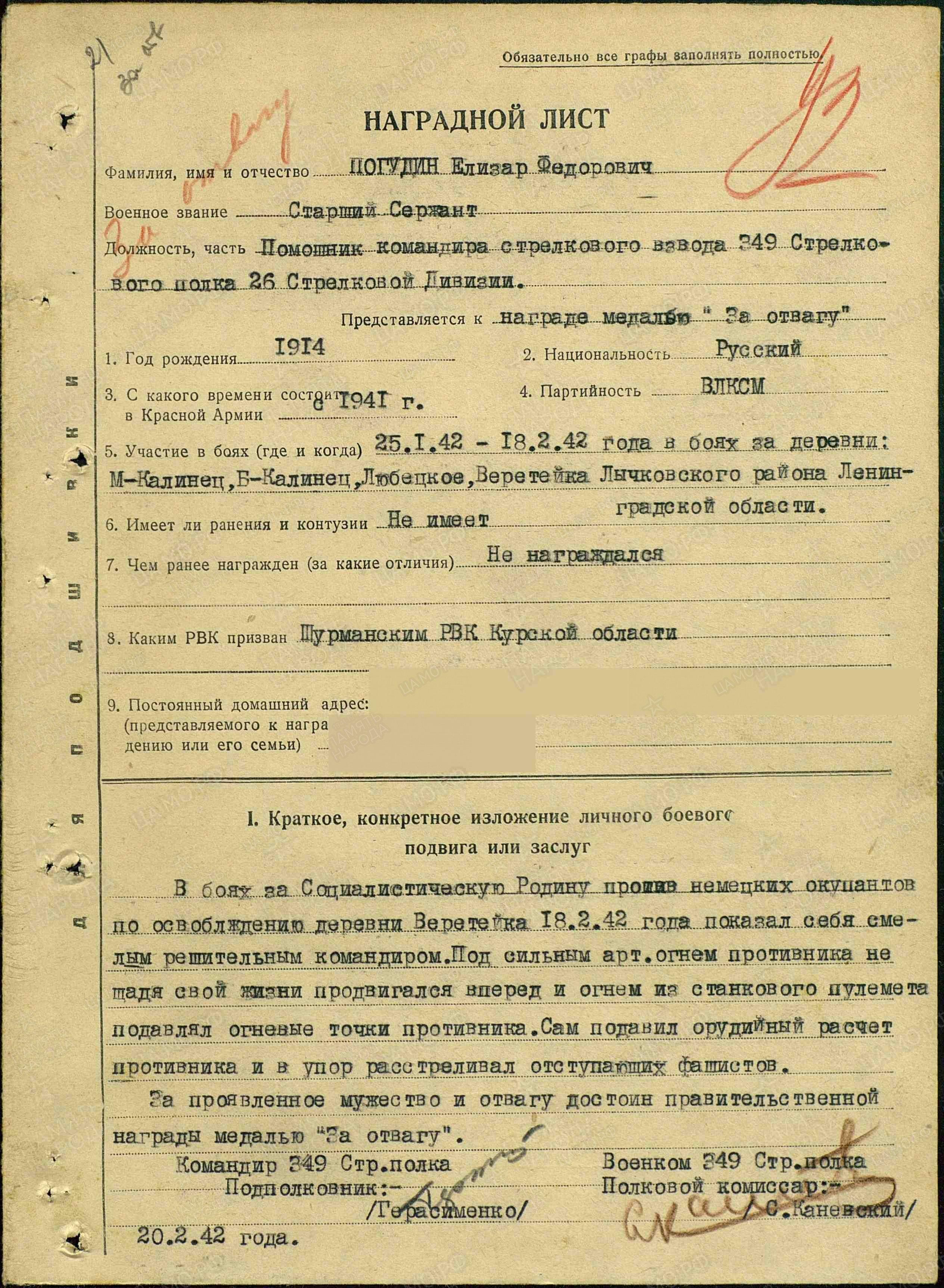 С декабря 1936 года по октябрь 1938 года на Дальнем востоке в 56 стрелковой дивизии. С декабря 1939 года по март 1940 года участвовал в советско-финской войне. С 1 июля 1941 года сражался в Великой Отечественной войне, был заместителем командира стрелкового взвода в звании старшего сержанта в 349 стрелковом полку 26 стрелковой дивизии Северо-Западного фронта. В боях против немецких оккупантов по освобождению деревни Веретейка 18 февраля 1942 года показал себя смелым и решительным командиром. Под сильным артиллерийским огнем противника, не щадя своей жизни, продвигался вперед и огнем из станкового пулемета подавлял огневые точки противника. Сам подавил орудийный расчет противника, расстреливал отступающих врагов. За проявленные мужество и отвагу приказом Военного совета Северо-Западного фронта от 5 марта 1942 года № 0253 награжден медалью «За отвагу». После ранения в июне 1943 года вернулся домой в пос. Опарино Кировской области. Работал председателем РайПО.