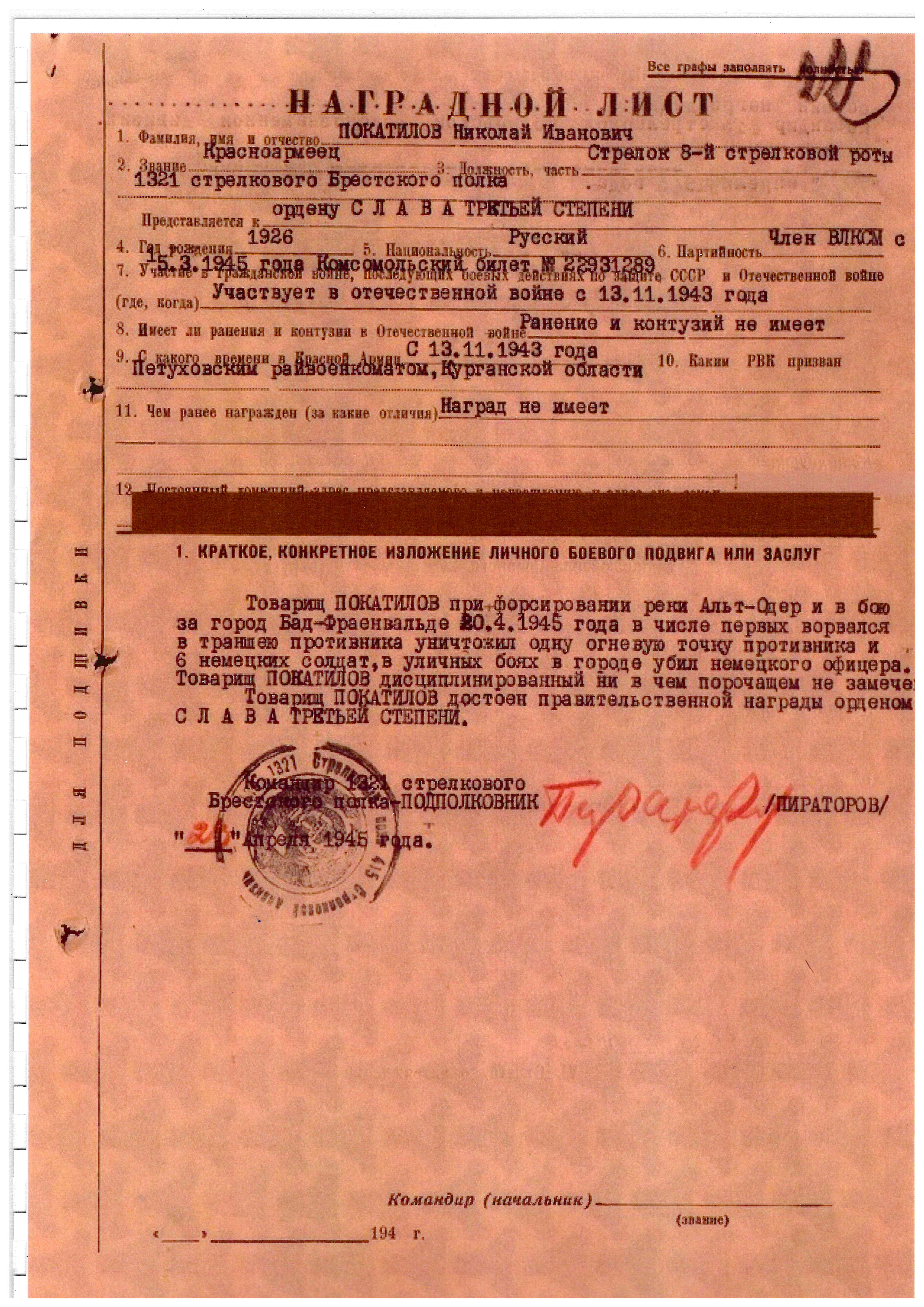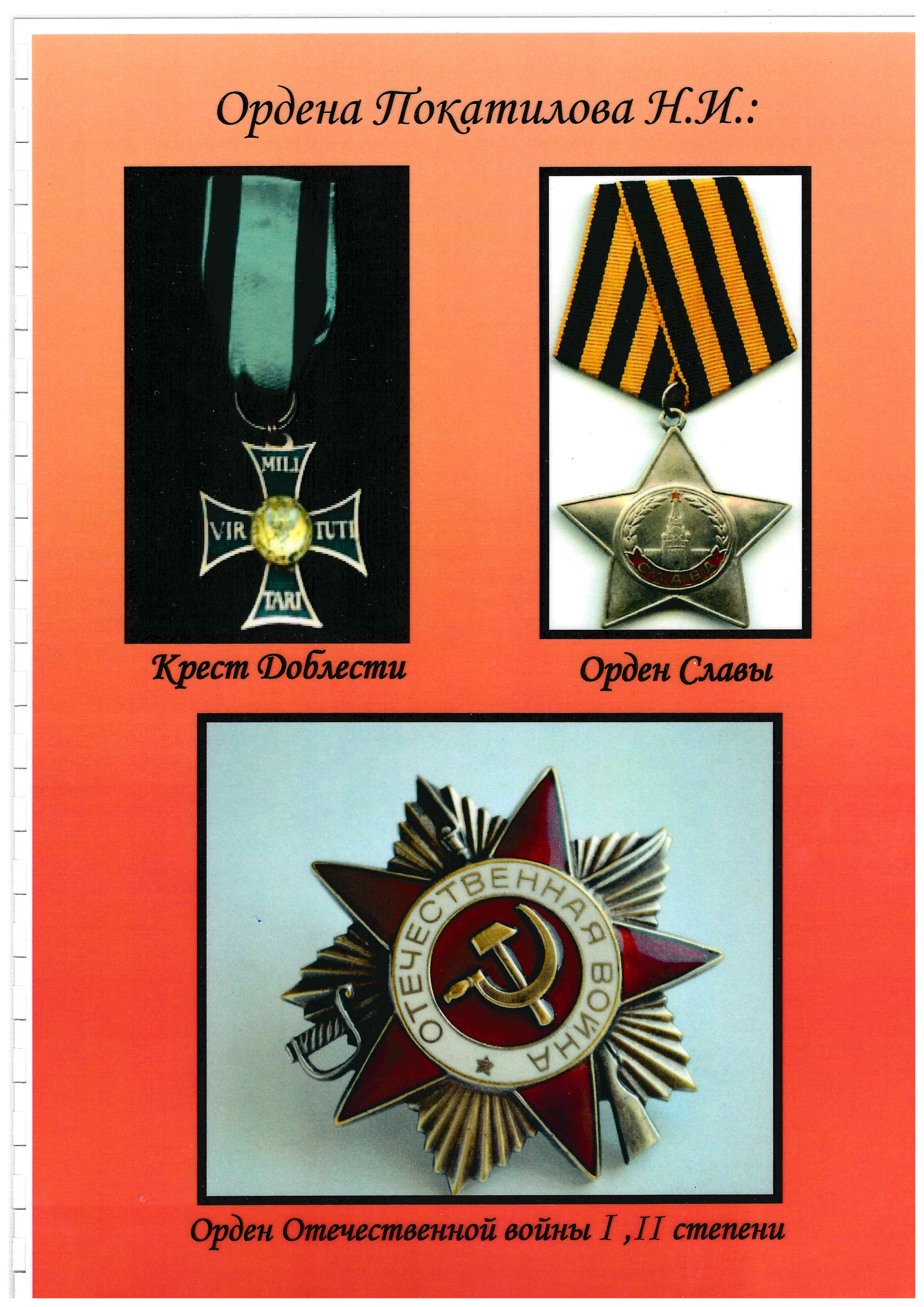 Родился в селе Казаркино Макушинского района. В силу возраста был призван в армию в ноябре 1943 года. После учебного танкового полка в городе Ялуторовск Тюменской области с мая 1944 года принял участие в боевых действиях . Воевал на Балтике, освобождал Прибалтику, Польшу. За освобождение Польши награжден крестом польской доблести. Товарищ Покатилов при форсировании реки Альт - Одер и в бою за город Бад - Фраенвальде 20.04.1945 года в числе первых ворвался в траншею противника, уничтожил одну огневую точку противника и шесть немецких солдат, в уличных боях убил немецкого офицера.