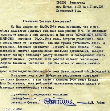 14-15 июня 1944 года в ходе Выборгско-Петрозаводской операции в районе деревни Лебя́жье (до 1948 года Ку́утерселькя, фин. Kuuterselkä)состоялось сражение, в результате которого советские войска прорвали финскую оборонительную линию ВТ. В этом сражении, мой дед Полковников Алексей Михайлович, поднимая в атаку бойцов своего отделения погиб 15 июня 1944 года