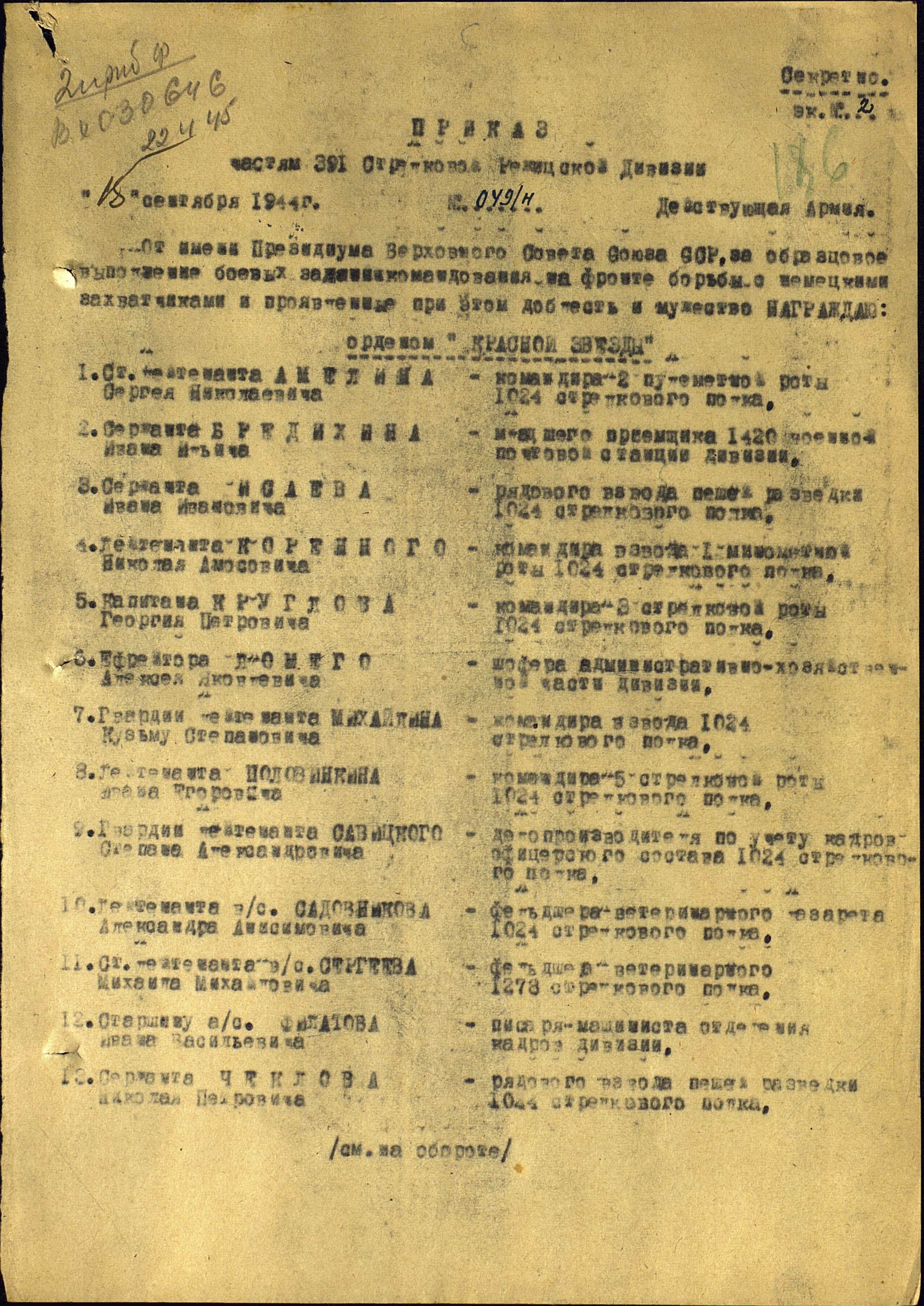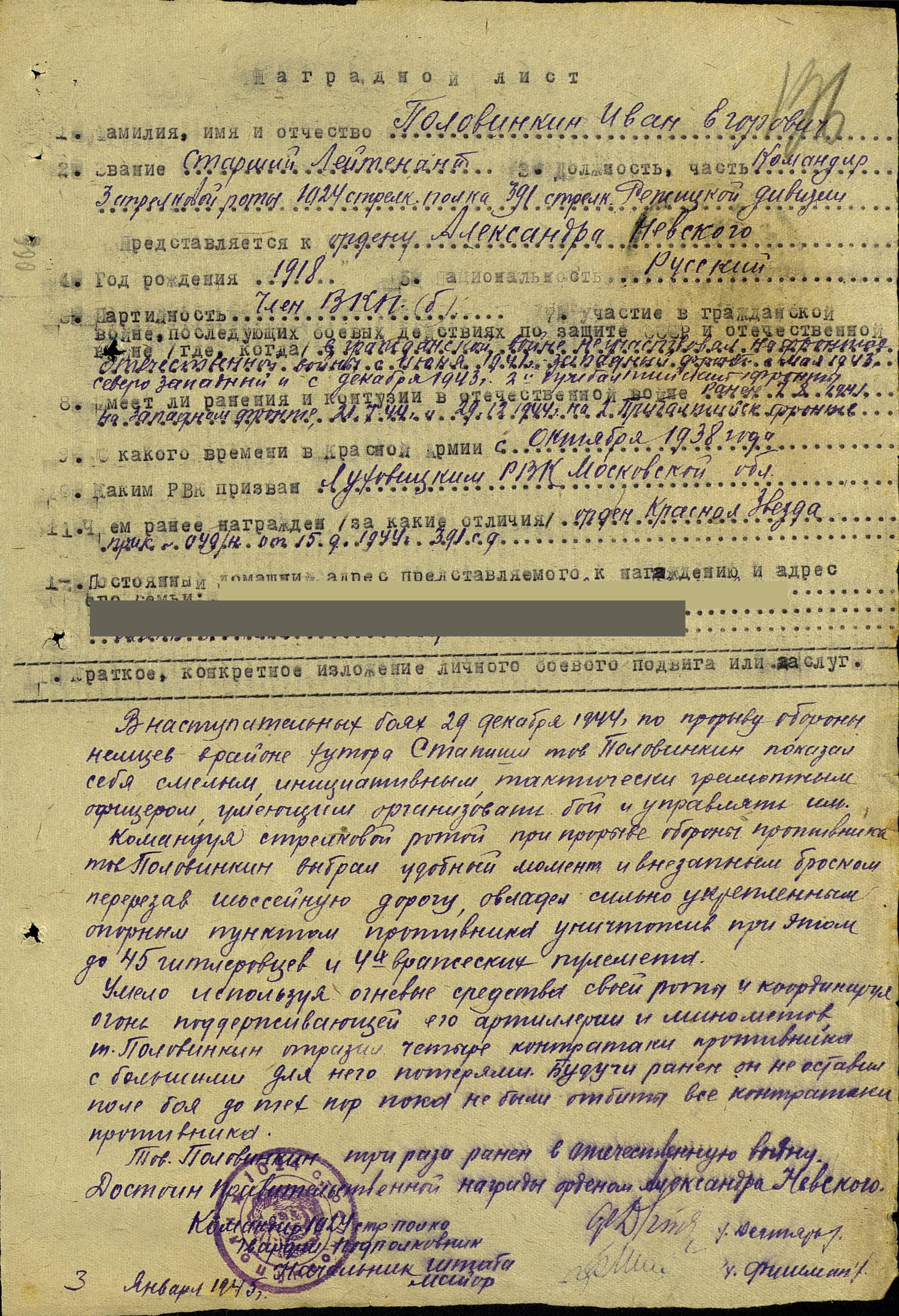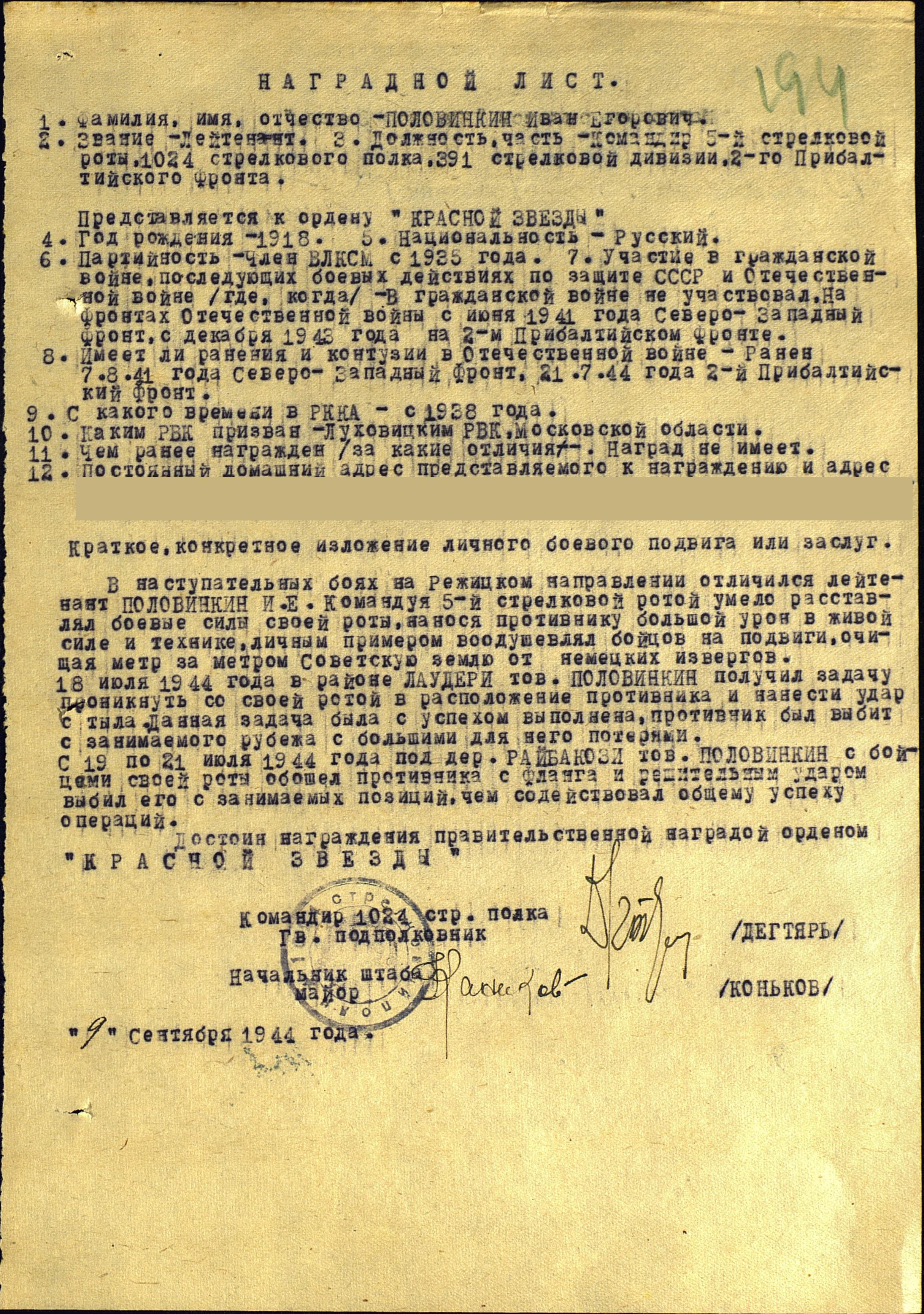 Кадровый офицер. Иван Егорович был призван в ряды Красной Армии в 1938 г. старшим лейтенантом. Он служил командиром 3 стрелковой роты 1024 стрелкового полка 391 стрелковой Режицкой дивизии. Воевал на Западном, Северо-Западном, Прибалтийском фронтах. Был три раз ранен, имеет много боевых и трудовых медалей и наград.
