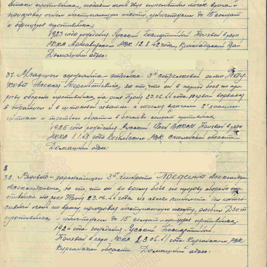 Год рождения: 01.06.1923 красноармеец в РККА с __.__.1942 года место рождения: № записи: 1005031153 Перечень наград 1 34/н 03.07.1944 Медаль «За отвагу»