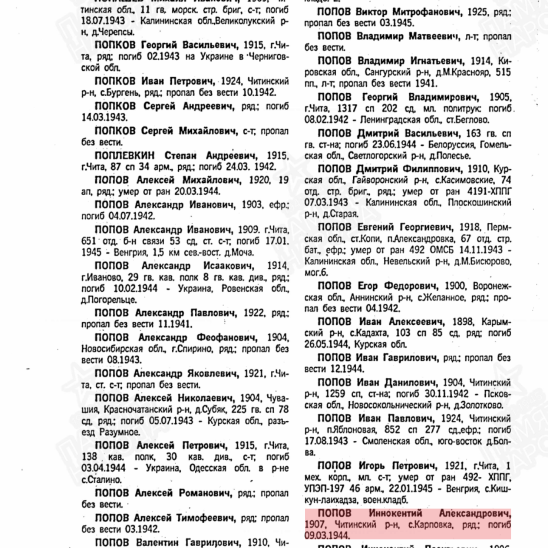 Мой прадед родился в далёком Забайкальском селе Карповка. Свой боевой путь начал в начале 1942 г. Прошел войну до Беларуссии. Получив ранение, скончался в военном госпитале. По неподтвержденным данным похоронен Витебской области. Память о воинах-защитниках, исполнившим свой долг до конца, будет хранится навсегда в моей семье. С большой гордостью мы будем передавать память о них другим поколениям.