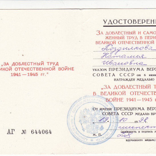 ополчении - копала окопы, дежурила по ночам на крышах домов. Награды: медаль «ЗА ДОБЛЕСТНЫЙ ТРУД В ВОВ1941-1945гг.»; юбилейная