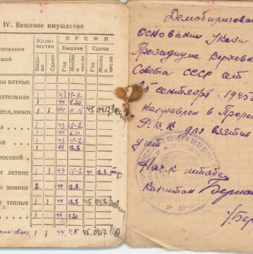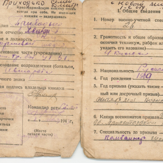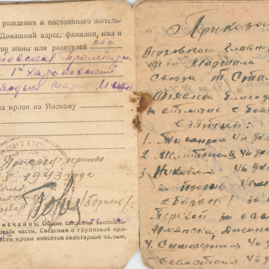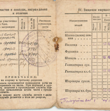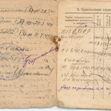 Призван в октябре 1941 годя Демобилизован в декабре 1945 Из красноармейской книжки… II Прохождение армейской службы октябрь 1941 год - 01.08.1942 год 217 ОМСР Южный фронт 01.08.1942-23.08.1942 окружение 23.08.1942-25.10.1942 в госпитале по ранению с 23.01.1943 - 14 арм. троф. батальон 18.12.1945 - убыл по демобилизации IV Участие в походах… Участвовал на фронтах Южный фронт - 1941 4-й Украинский фронт -1943 1-й Прибалтийский фронт -август 1944 2-й Прибалтийский фронт - март 1945 Ленинградский фронт -апрель 1945 Приказом Верховного главнокомандующего маршала Советского Союза т. Сталина объявлена благодарность за отличие в боях при взятии г. Таганрога - 4-й Ук. фр.- 30.08.43 г. Мелитополя - 4-й Ук. фр. - 23.10.43 г. Никополя - 4-й Ук. фр. - 8.2.44 за прорыв немецкой обороны за Сиваш, Перекоп, за освобождение Армянска, Джанкоя - 4-й Ук. фр. - 11.4.44 г. Симферополя - 4-й Ук. фр. -13.4.44 г. Севастополя - 4-й Ук. фр. - 10.5.44 г. Поневеж - 1-й Пр. фр. -22.7.44 г. Шауляй - 1-й Пр. фр. -27.7.44 г. Митава - 1-й Пр. фр. -31.7.44