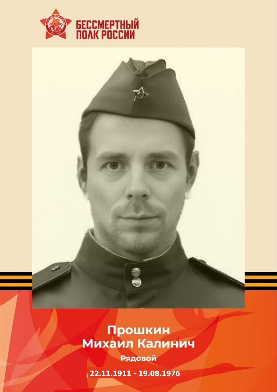 Прошкин Михаил Калинич (1911 – 1976) История нашей семьи неразрывно связана с историей большой страны. Наш герой, Прошкин Михаил Калинич, родился в деревне Прошкина Туринского района Свердловской области. В суровом 1941 году он был призван на фронт, чтобы с оружием в руках защищать мирное небо над Родиной. Михаил Калинич прошел всю Великую Отечественную войну в рядах пехоты в звании рядового. Пехота — это «соль» войны, самый тяжелый и самоотверженный труд солдата. В решающий период с декабря 1944 по апрель 1945 года он сражался в составе 193-й отдельной роты обслуживания Западного и 3-го Белорусского фронтов. На его боевом пути были легендарные сражения: он принимал участие в Восточно-Прусской стратегической операции и историческом штурме города-крепости Кёнигсберга. За мужество и доблесть, проявленные в этих кровопролитных боях, Михаил Калинич был награжден медалью «За взятие Кёнигсберга». Мы помним и гордимся подвигом нашего деда. Его жизненный путь — это пример истинного патриотизма, скромности и верности своему долгу. Вечная память герою! «ГОРДИМСЯ, ПОМНИМ!»