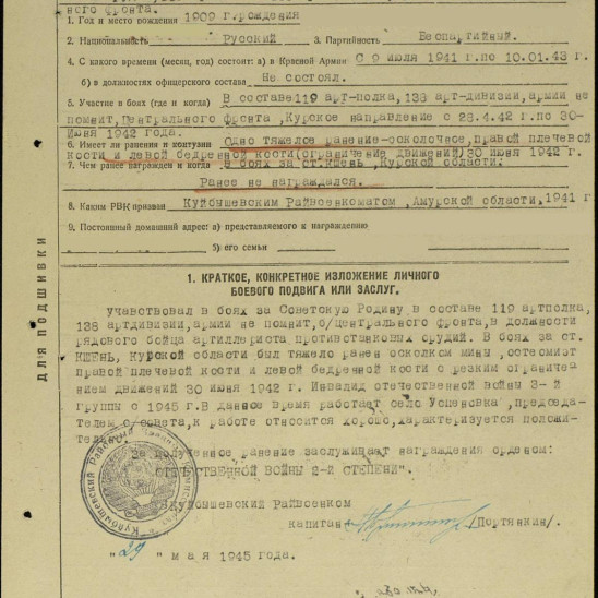 мой прадед ,рядовой артиллерист противотанковых орудий 119 арт-полка 138 арт-дивизии. в курской области 30 июня 1942 получил тяжелое осколочное ранение. инвалид отечественной войны 3-й группы