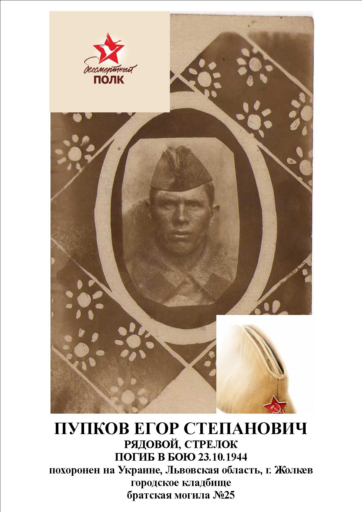 Рядовой Пупков Егор Степанович родился в д. Скатово Белозерского района, Курганской области. Призван в ряды Советской армии в 1942 году. Рядовой, стрелок. Погиб в бою за Социалистическую Родину, верный воинский присяге, проявив геройство и мужество был ранен и умер от ран 23 октября 1944 года. Похоронен с отданием почестей на кладбище города Жолкев Львовской области.