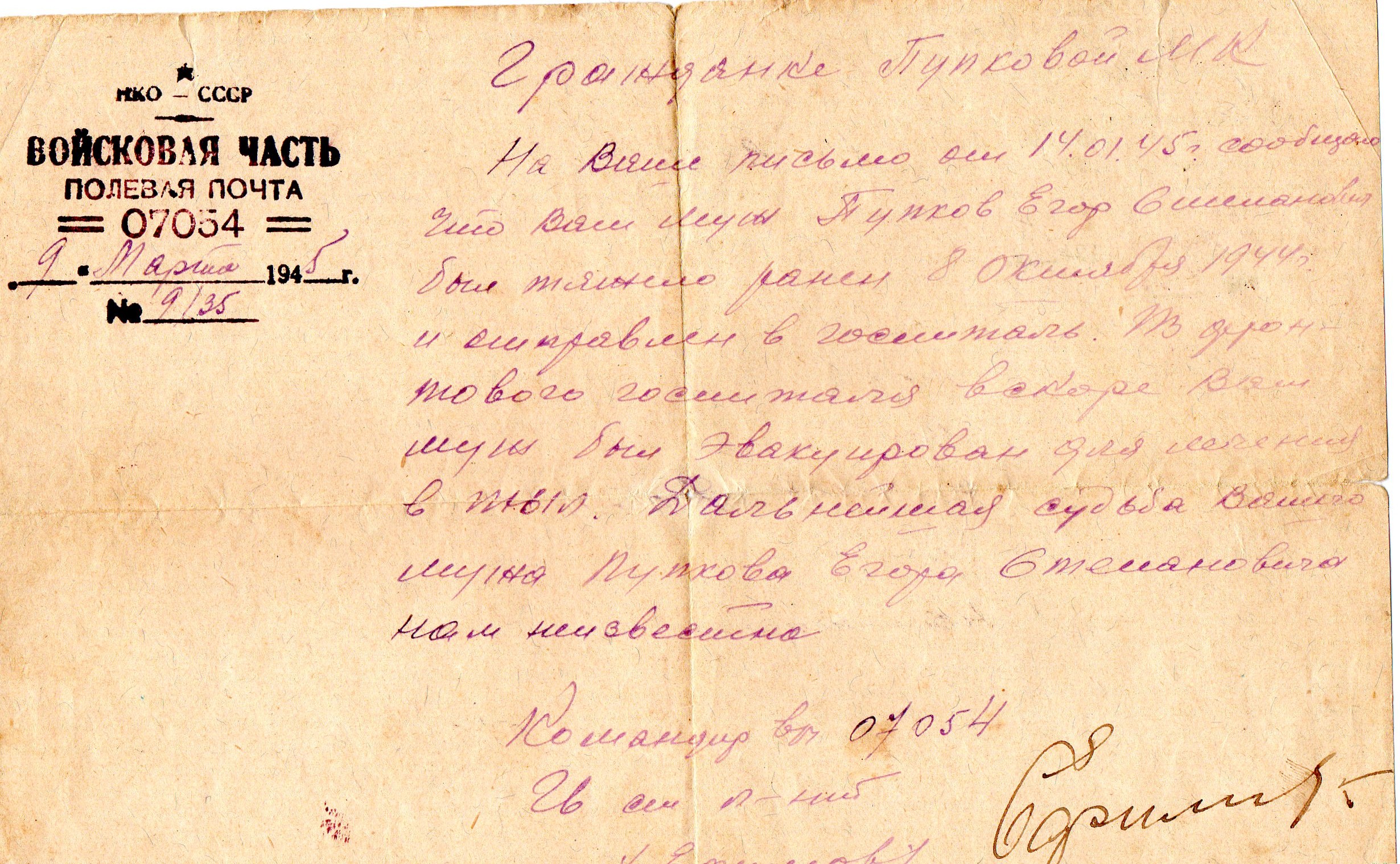 Основание: Извещение № 0501 от 24 октября 1944 года. Дело 5 том 3 с извещениями на погибших, пропавших без вести офицерского, сержантского и рядового состава в период Великой Отечественной войны по Белозерскому РВК инв 860 (арх) отдела ВК Курганской области по Варгашинскому, Белозерскому и Мокроусовскому районам стр. 354.